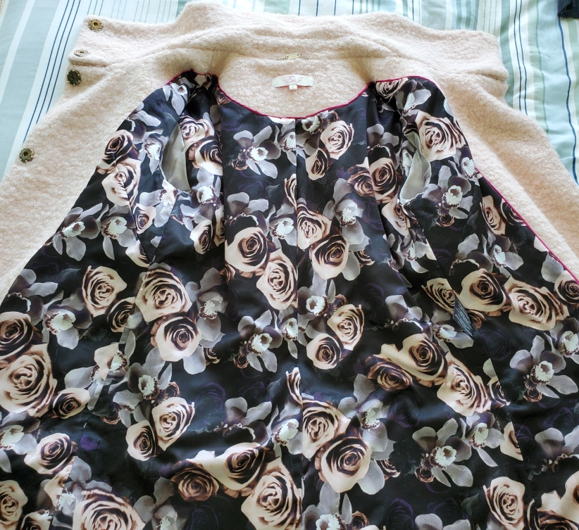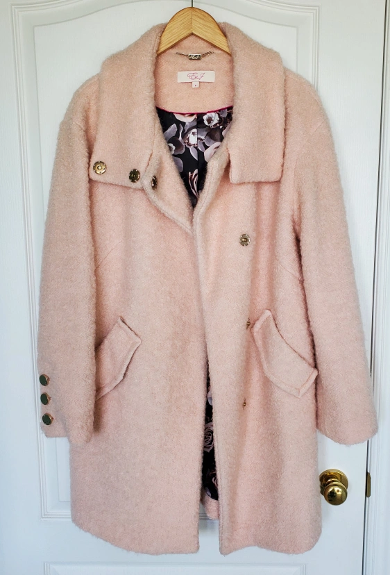 82Gorgeous peach color coat in perfect condition. It's soft and warm, with a beautiful floral lining. Above the knee length, measuring 36" long, can fit sizes S-M. Only worn once, no stains, tears or other damage. From smoke free, pet free home. Pickup from South Etobicoke.