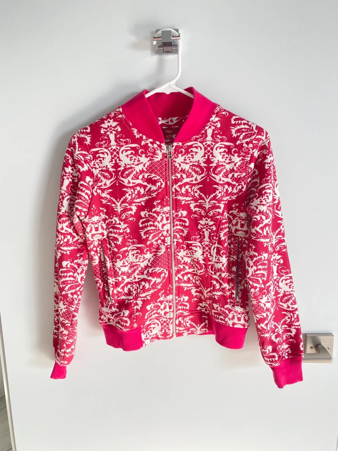 Selling a cute pink bomber woollen jacket in size medium. Has two pockets. It's a vibrant pink colour with a white baroque pattern. This is stylish and will keep you super warm! ❤️Check out my other listings!