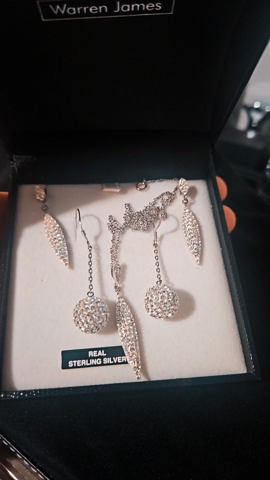 Beautiful Warren James jewellery set in its original box! This set includes a necklace and two pairs of earrings. All pieces are crafted from real sterling silver and feature a sparkling design. Perfect for adding a touch of elegance to any outfit!