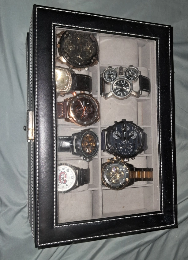 27Selling a black leather watch display case. It can hold multiple watches and keep them organized and protected. Great for watch collectors!