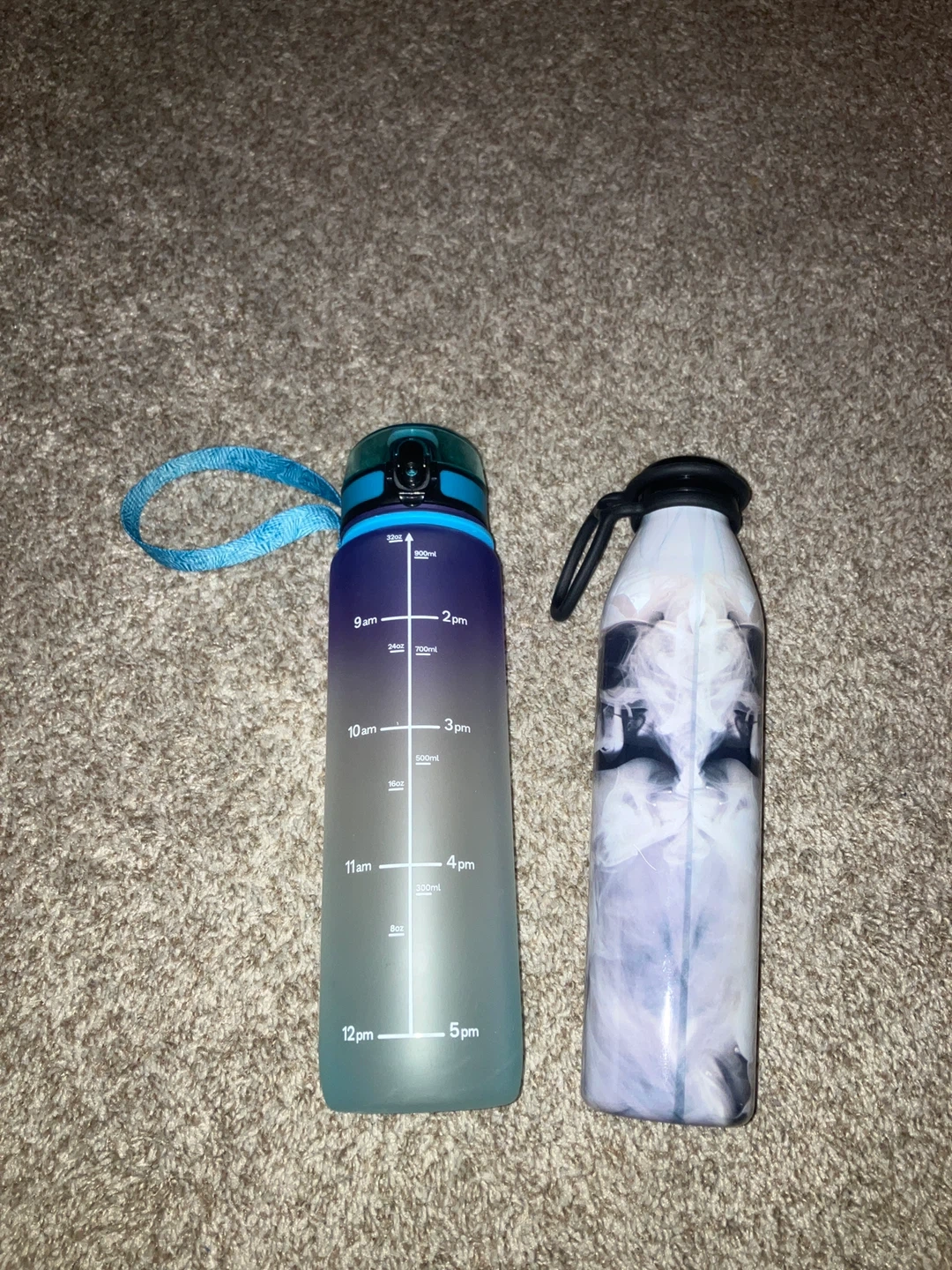 18Two water bottles are available. One bottle is blue and purple with time markings and volume measurements. The other bottle has a white and grey swirled design