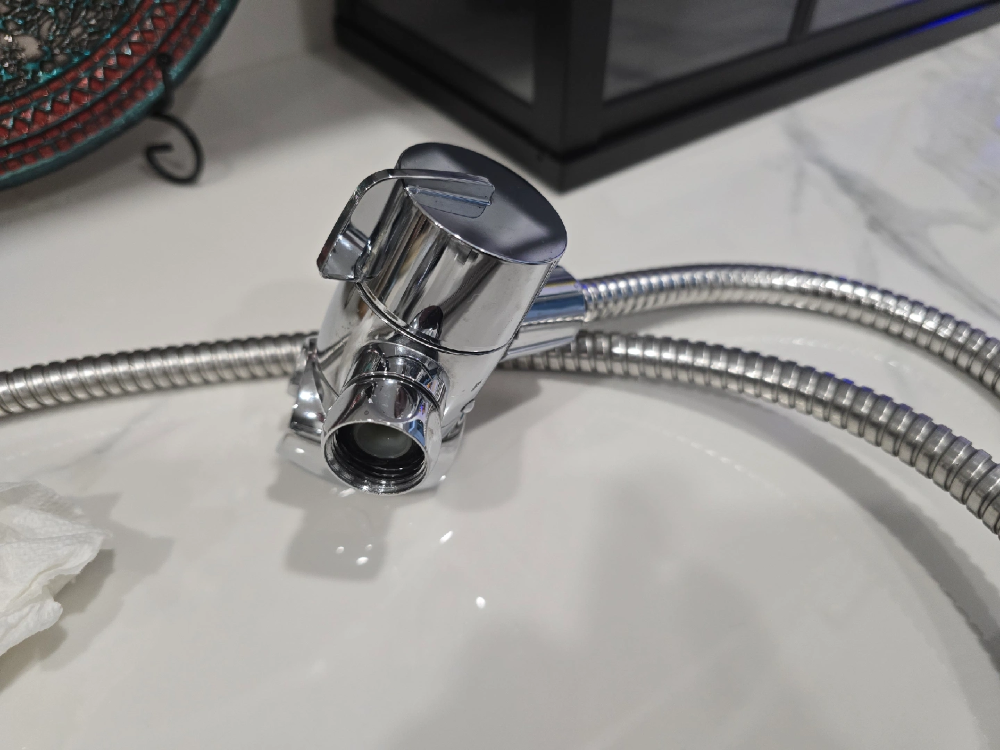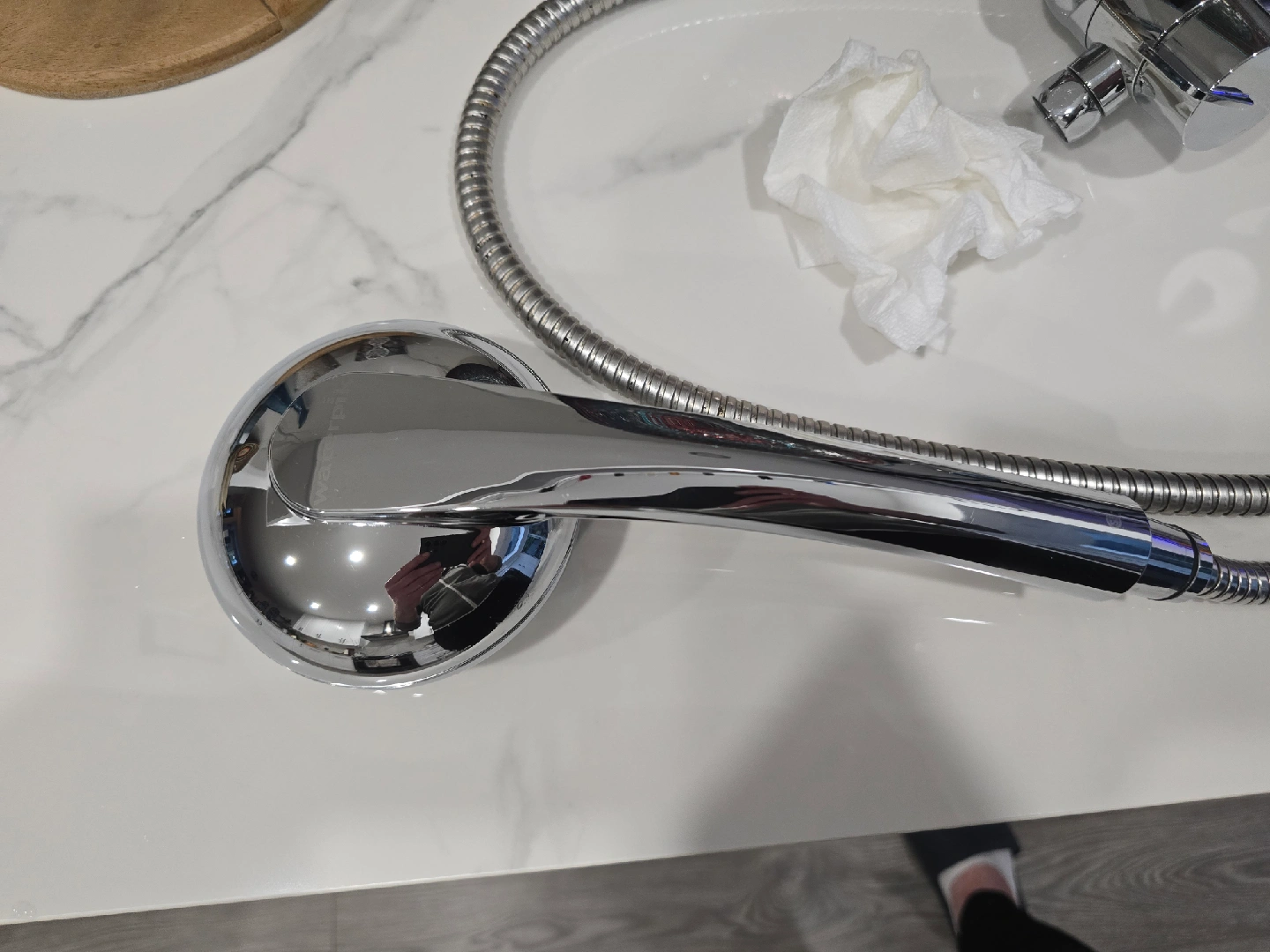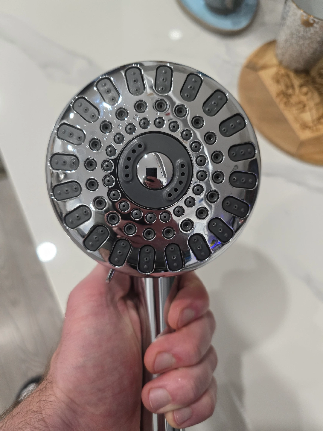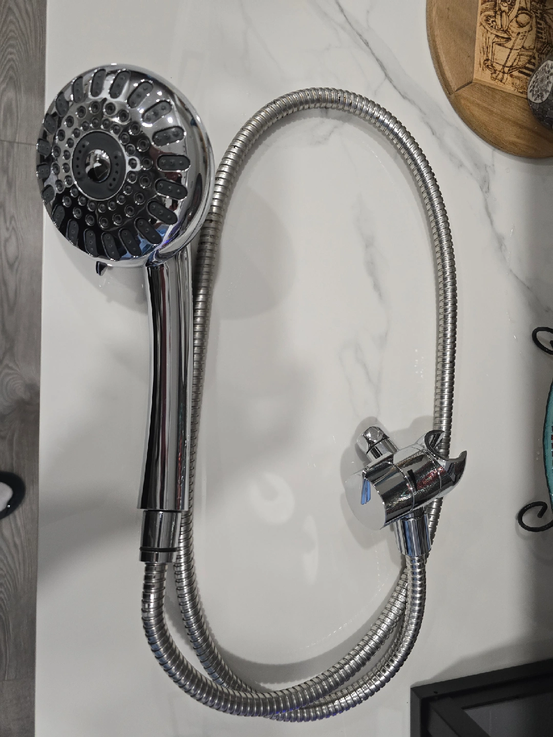 60Selling a handheld shower head with a hose. Chrome with 6 flow settings including massage. It's in great condition and ready to be installed in your bathroom. Perfect for a quick rinse or a more thorough wash!
