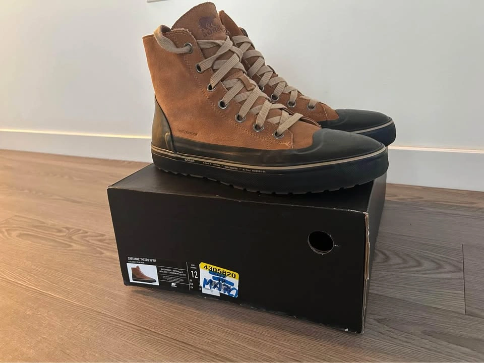 15Sorel Boot Cheyanne Metro Hi Men Material: Suede/Rubber Lining: Microfleece Sole: Rubber Insole: Memory foam Closure: Lace up Special Embellishment: Logo Waterproof Removable Insole