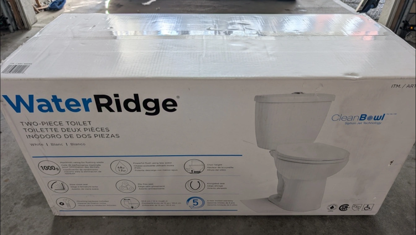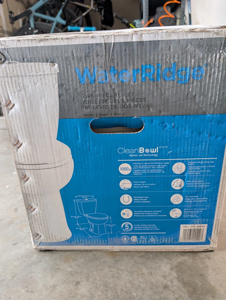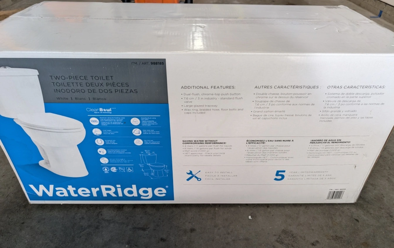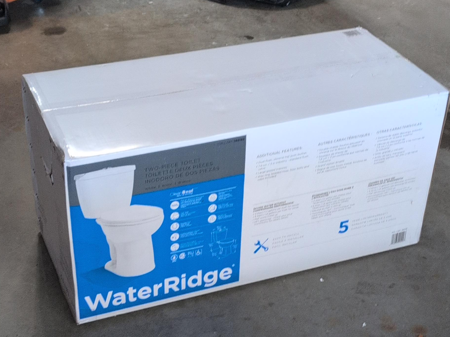 Selling a brand new WaterRidge two-piece toilet still in its original packaging! It's white and features CleanBowl siphon jet technology. Includes all the necessary components for installation. Ready for a new home! Bought it a couple years ago and just never installed it. A new one from Costco is 200$ +