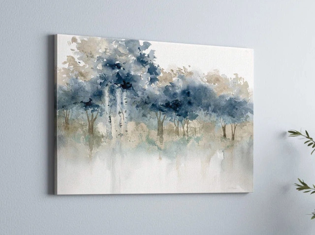 This painting print gives you a serene, nature-themed addition to any room in your home. It's a classic landscape of a grove of trees along the water's edge, and it features a harmonious blend of greens and blues that fade into a grayish backdrop. This watercolor painting is printed on a rectangular canvas and wrapped around a beveled solid wood stretcher bar for a gallery-worthy look we love. Dimensions: 5ft x 39.75in Price: $135 Pick up only, serious offers only please.