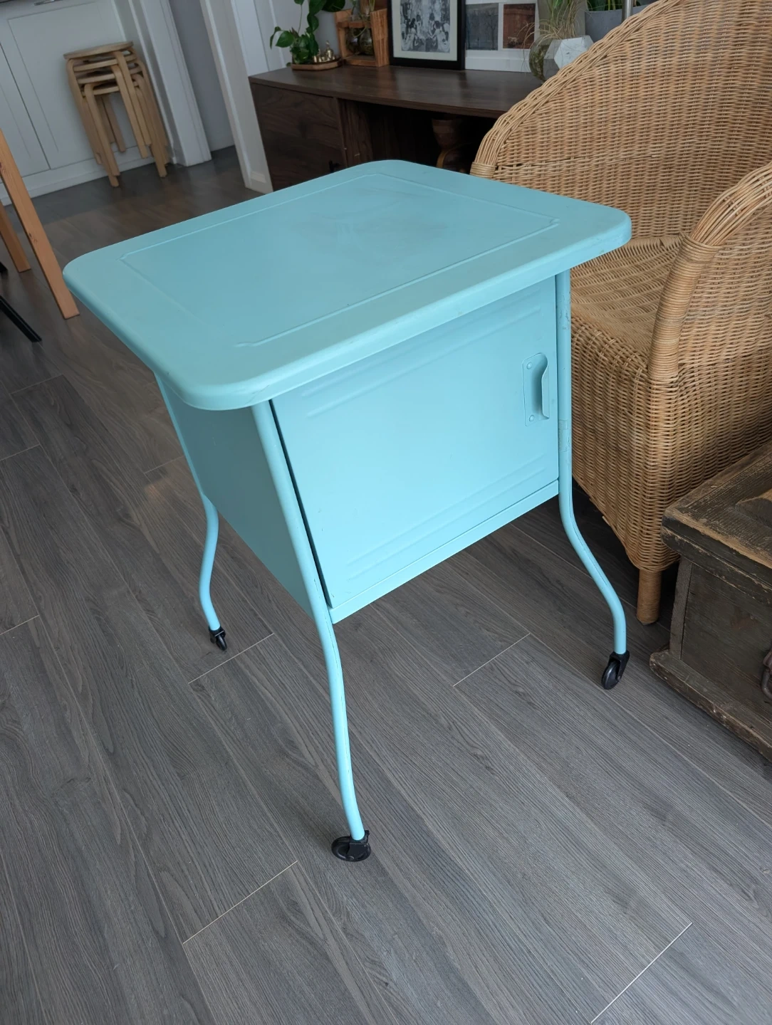A light mint green metal side table with a single door cabinet and wheels. It's perfect for use as a nightstand or accent table. Metal construction.