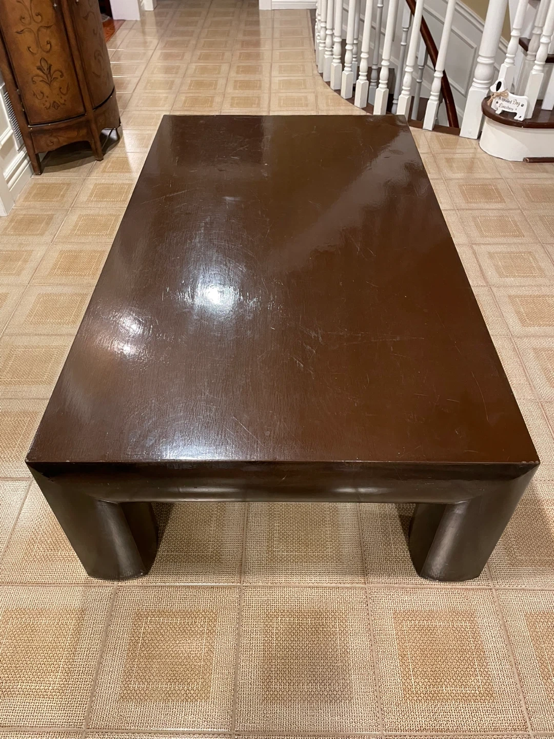 This dark brown coffee table has a sleek, rectangular design. It's heavy and solid. Has some scuffs. 32”x 55”