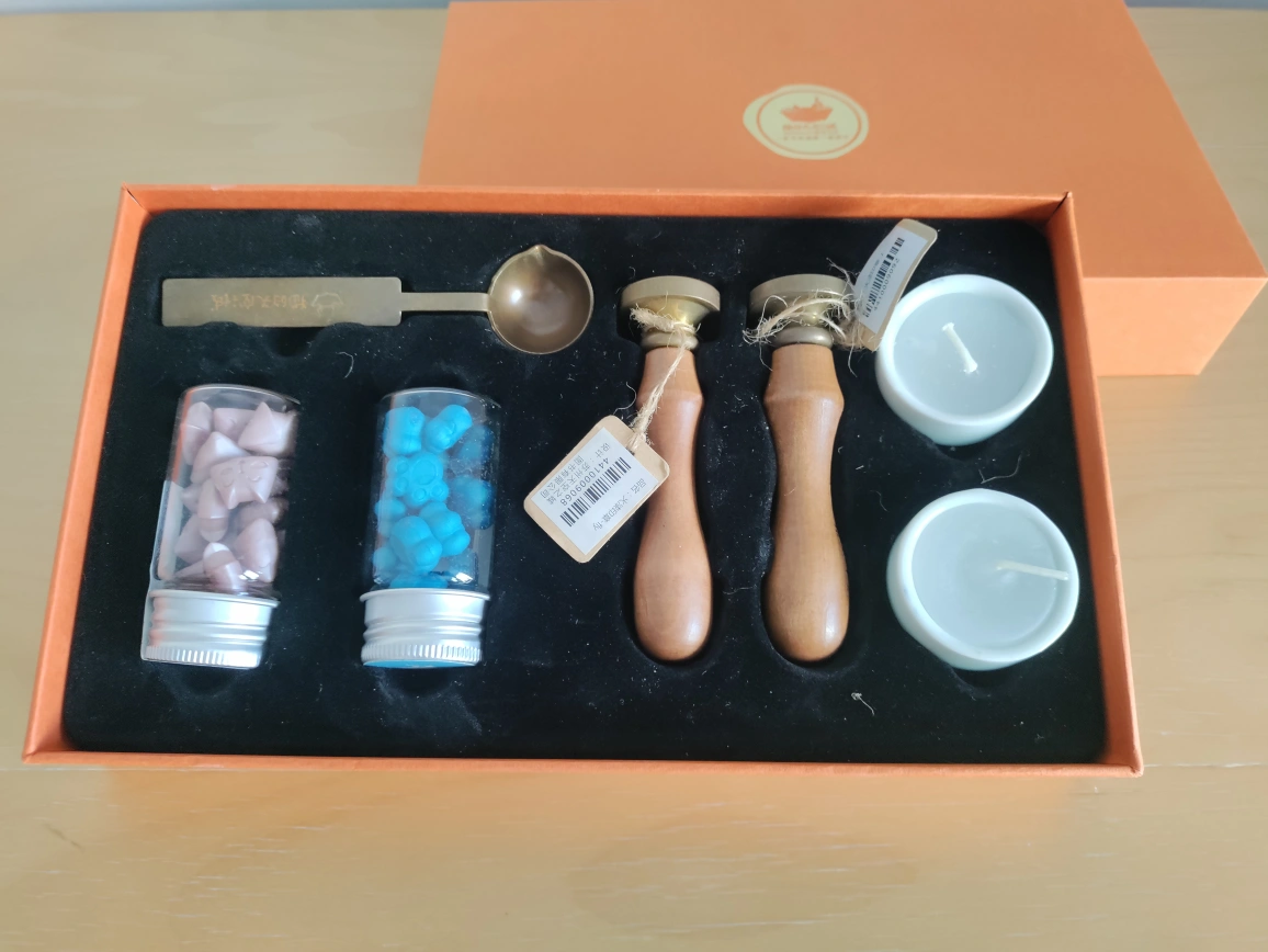 New wax seal kit. Includes two wooden handle stamps, a metal spoon, two small jars of coloured wax, and two small white candles. All in an orange gift box.