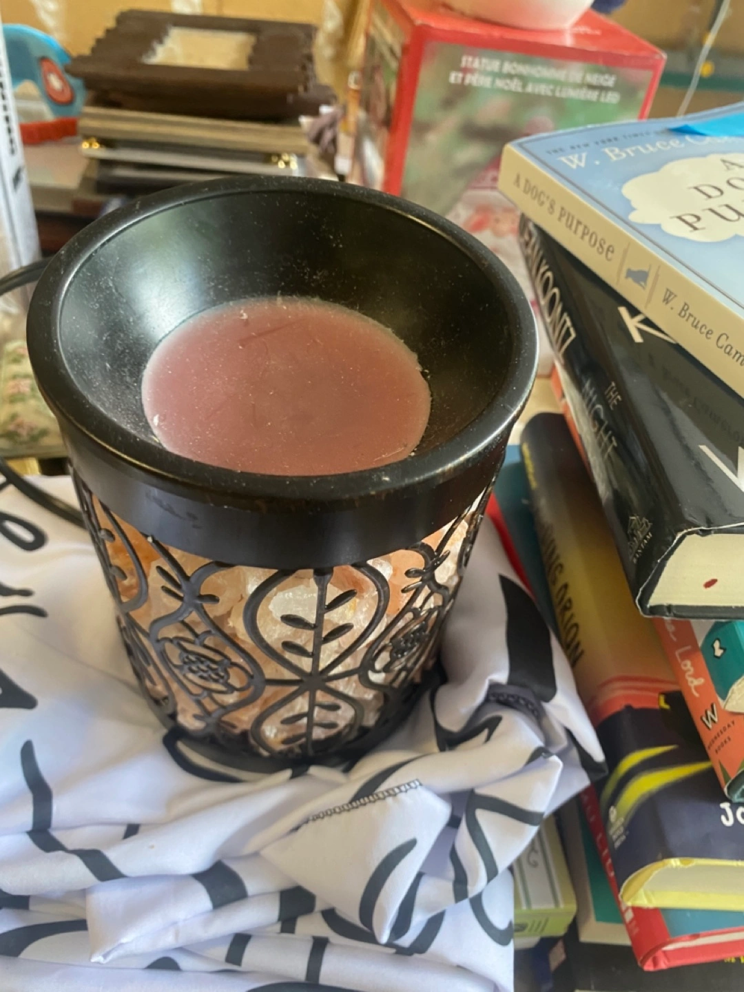 Selling a used wax warmer in good condition. It features a black metal frame with a decorative leaf pattern. The warmer includes a dish for melting wax melts. Perfect for adding a cozy fragrance to your home! Himalayan rocks