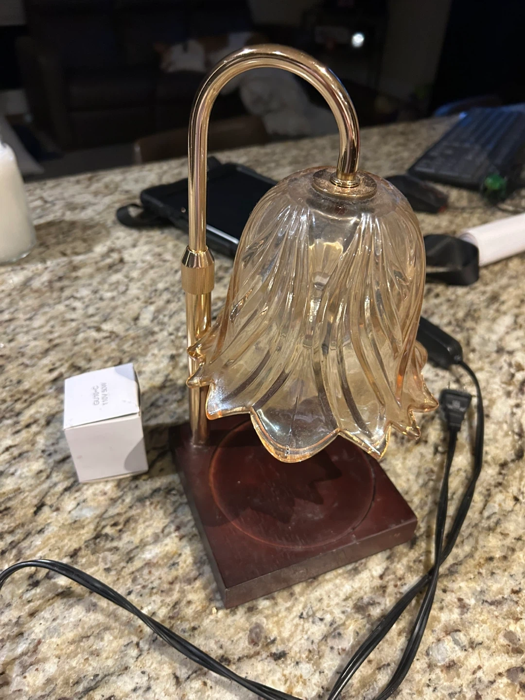 Selling a wax warmer lamp! It's in great condition and ready to add some ambiance to your space. The lamp has a gold coloured metal stand and a glass shade. It comes with the power cord.