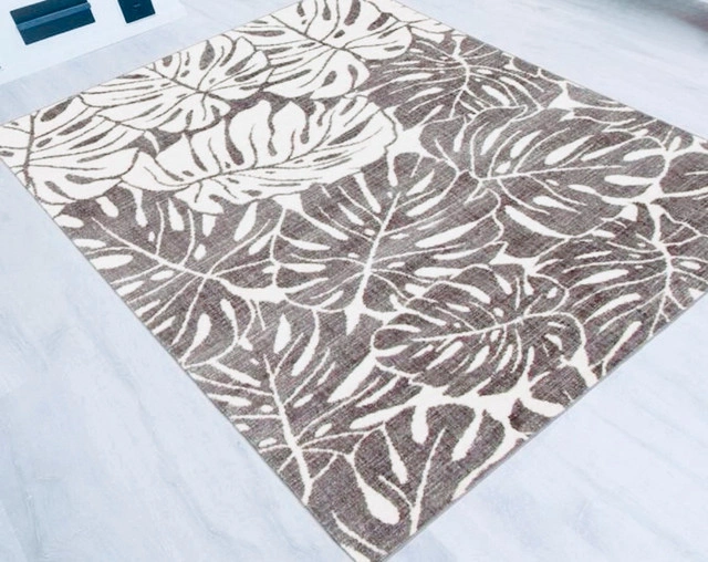 73This is a stylish grey leaf pattern carpet, sized at 160 cm by 230 cm, perfect for adding a touch of modern elegance to any room. This item is used and in good condition. * Dimensions: 160 cm x 230 cm * Colour: Grey and white * Pattern: Leaf This carpet has a great design and is ready to be the next beautiful addition to your home! And a friendly reminder, if the ad is up, it's still available!
