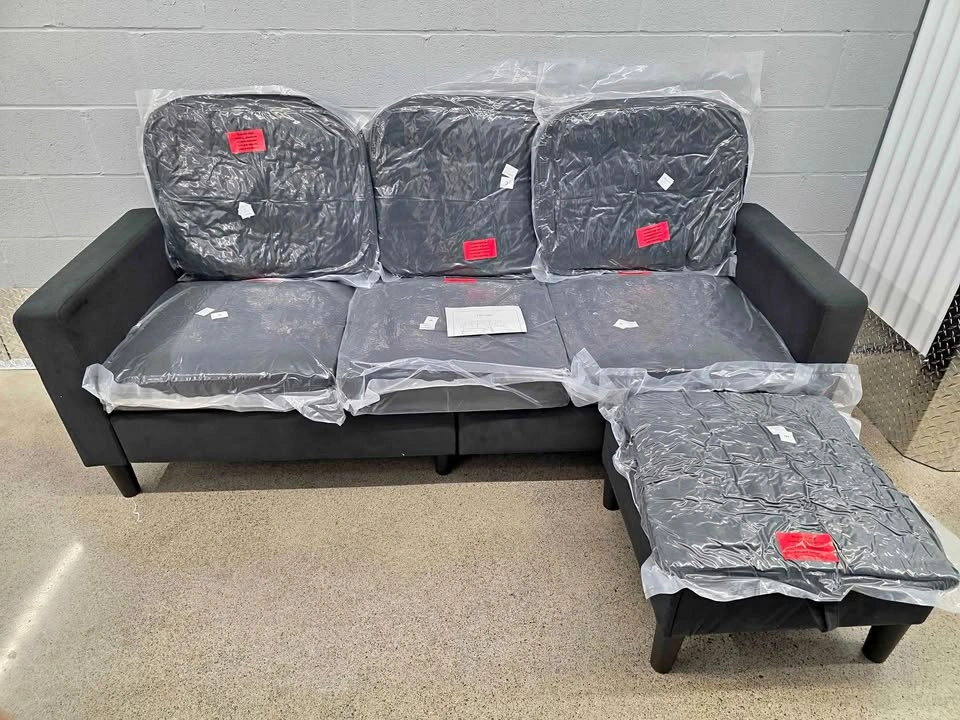 49Modern 3-seater sectional sofa with chaise + ottoman, perfect for condos, apartments, or small living spaces. Upholstered in durable fabric with thick cushions for comfort. Can be sold assembled or unassembled depending on your preference. Key Features: Brand New – still in packaging (pulled from a liquidation pallet) Includes: Sofa + Chaise + Ottoman Compact size – fits small apartments, condos, basements Comfortable cushioned seating Easy assembly with included instructions Priced for a quick sale!