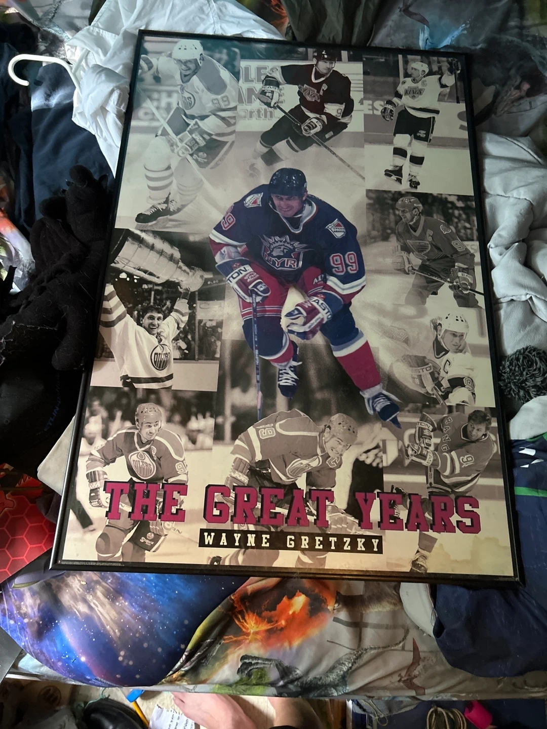 Selling a framed poster of Wayne Gretzky, titled 'The Great Years'. It features images of him playing for various teams like the Oilers, Kings, and Rangers. A great piece for any hockey fan!