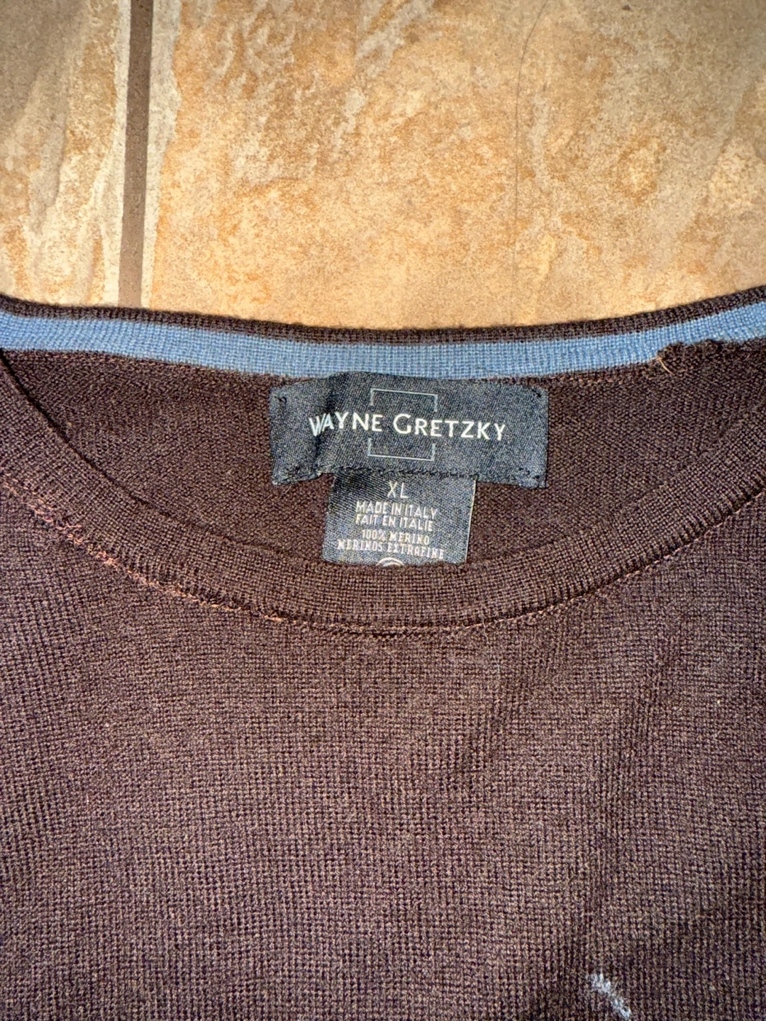 Wayne Gretzky sweater in size XL! This sweater is made in Italy and is made of Merino wool. It is brown with a blue argyle pattern on the front