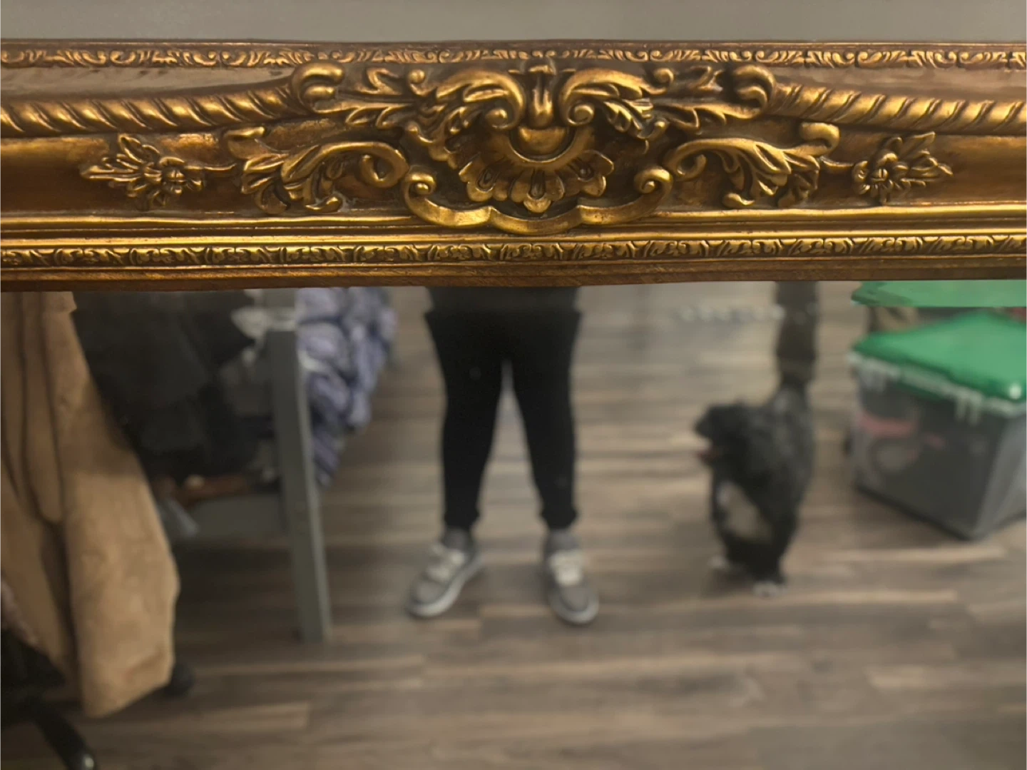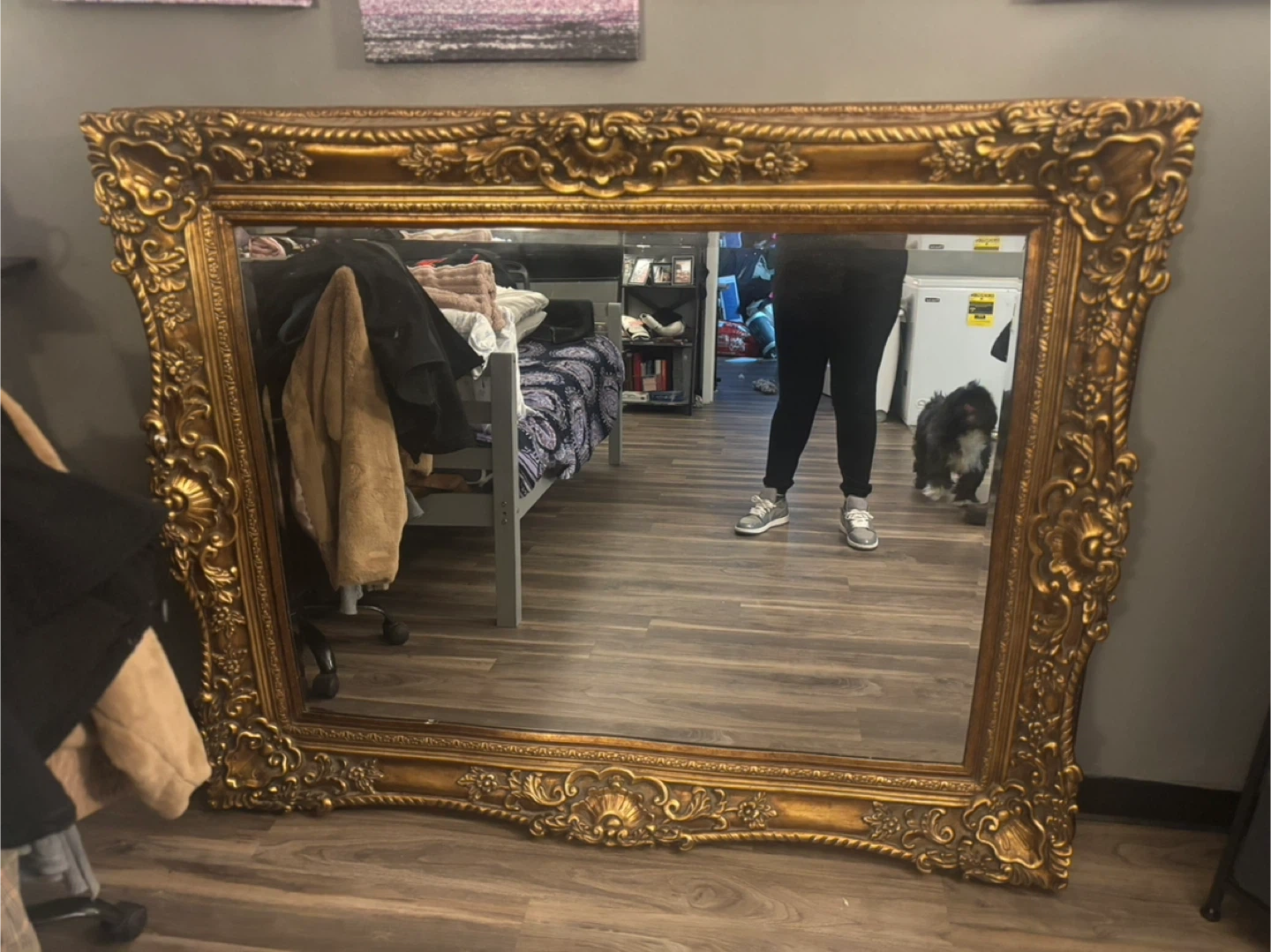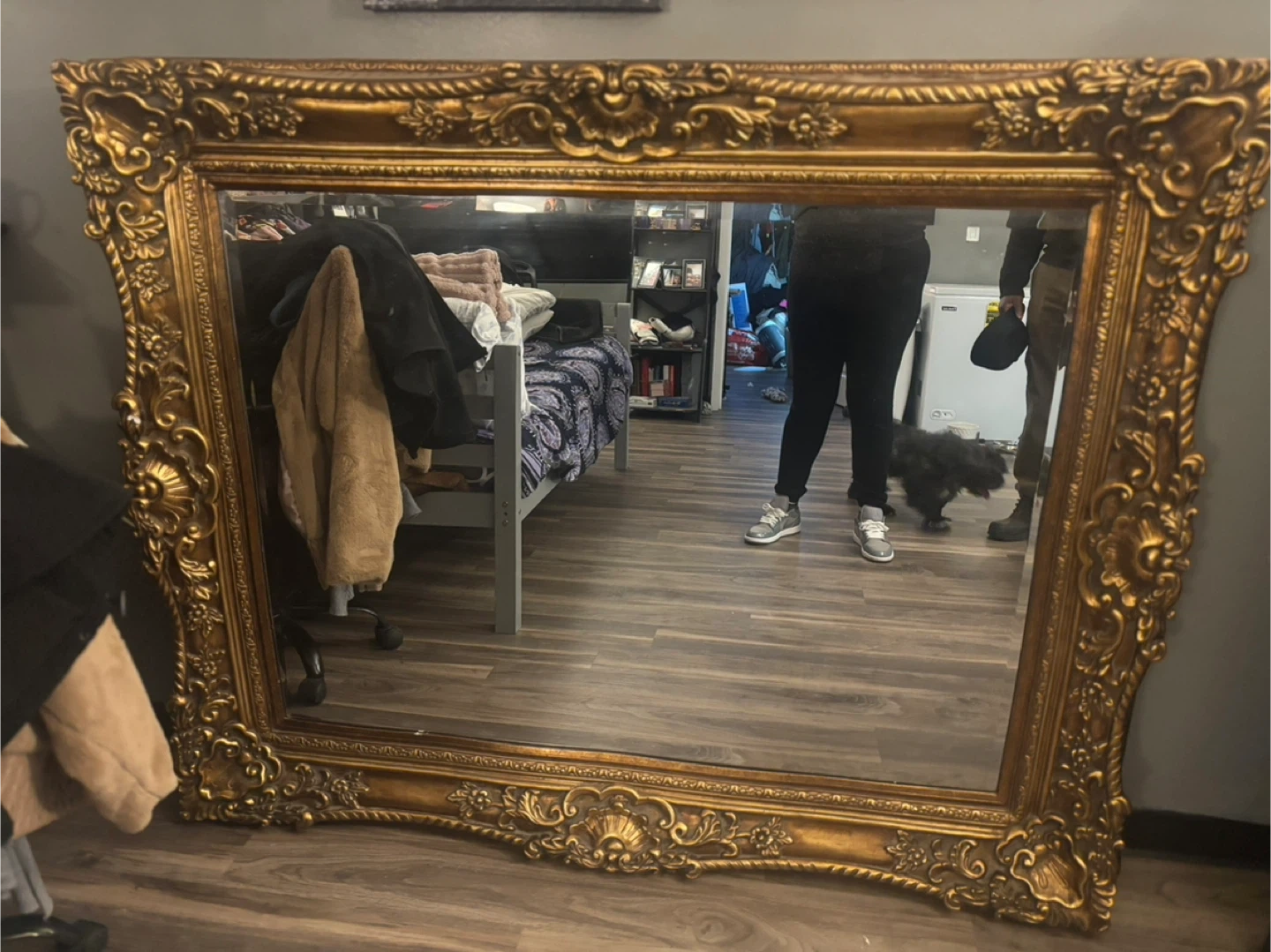 This is a large antique mirror with an ornate gold frame. It's a substantial piece perfect for making a statement in any room. Frame material appears to be wood with a gilded finish. Likewise there are brackets and wire for hanging already installed in the piece.