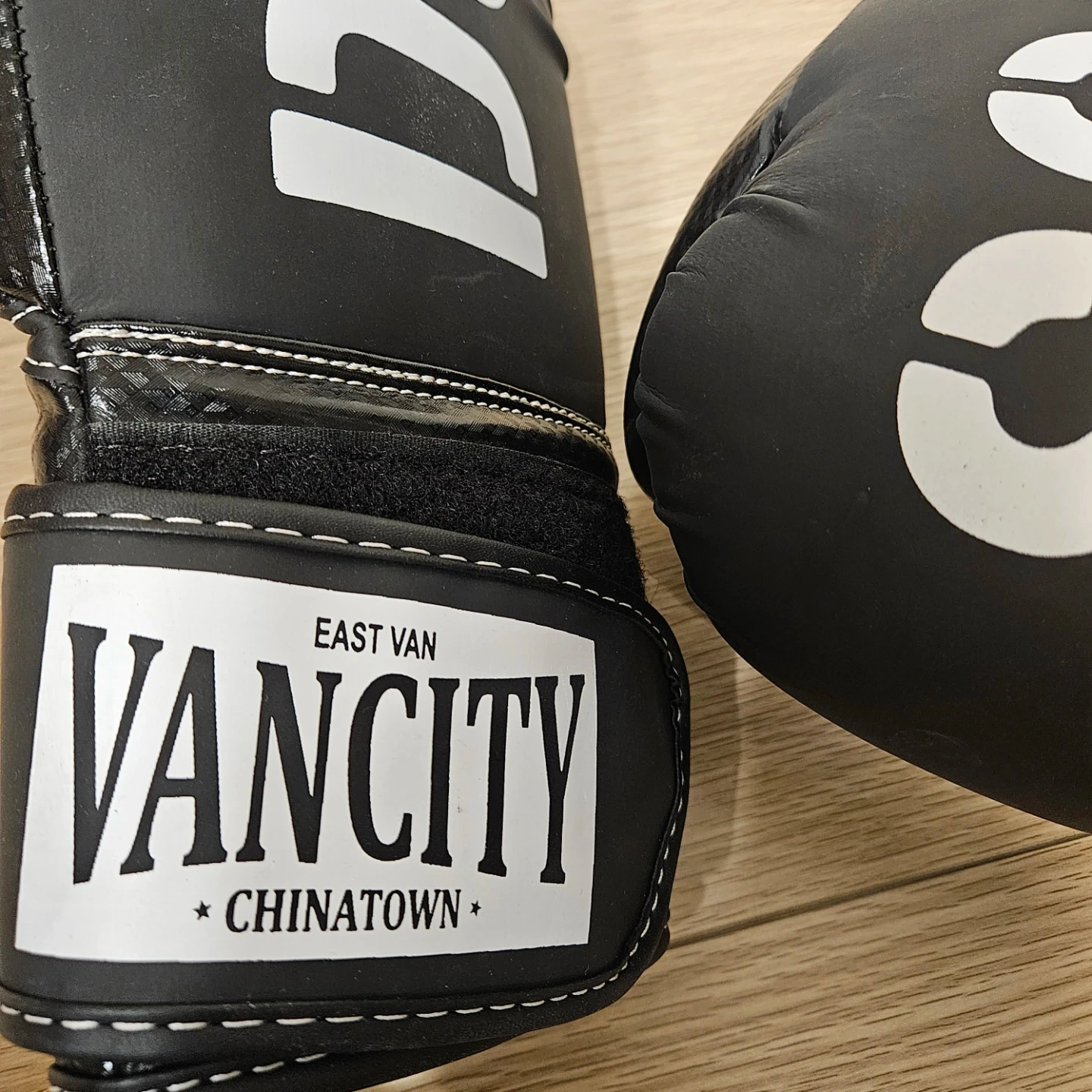 A pair of Black boxing gloves from VANCITY DCS, East Van Chinatown. Features a durable material and secure velcro strap closure. Great for training!