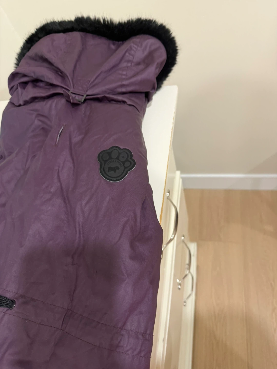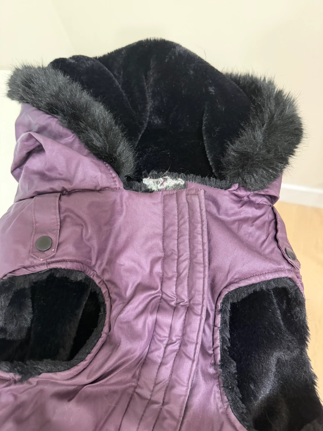 Canada Pooch winter dog vest is lined with black faux fur for warmth. It features a hood and adjustable closures. Size 26. Used only a couple of times, has a small rip but not noticeable and it was caused due to a move.