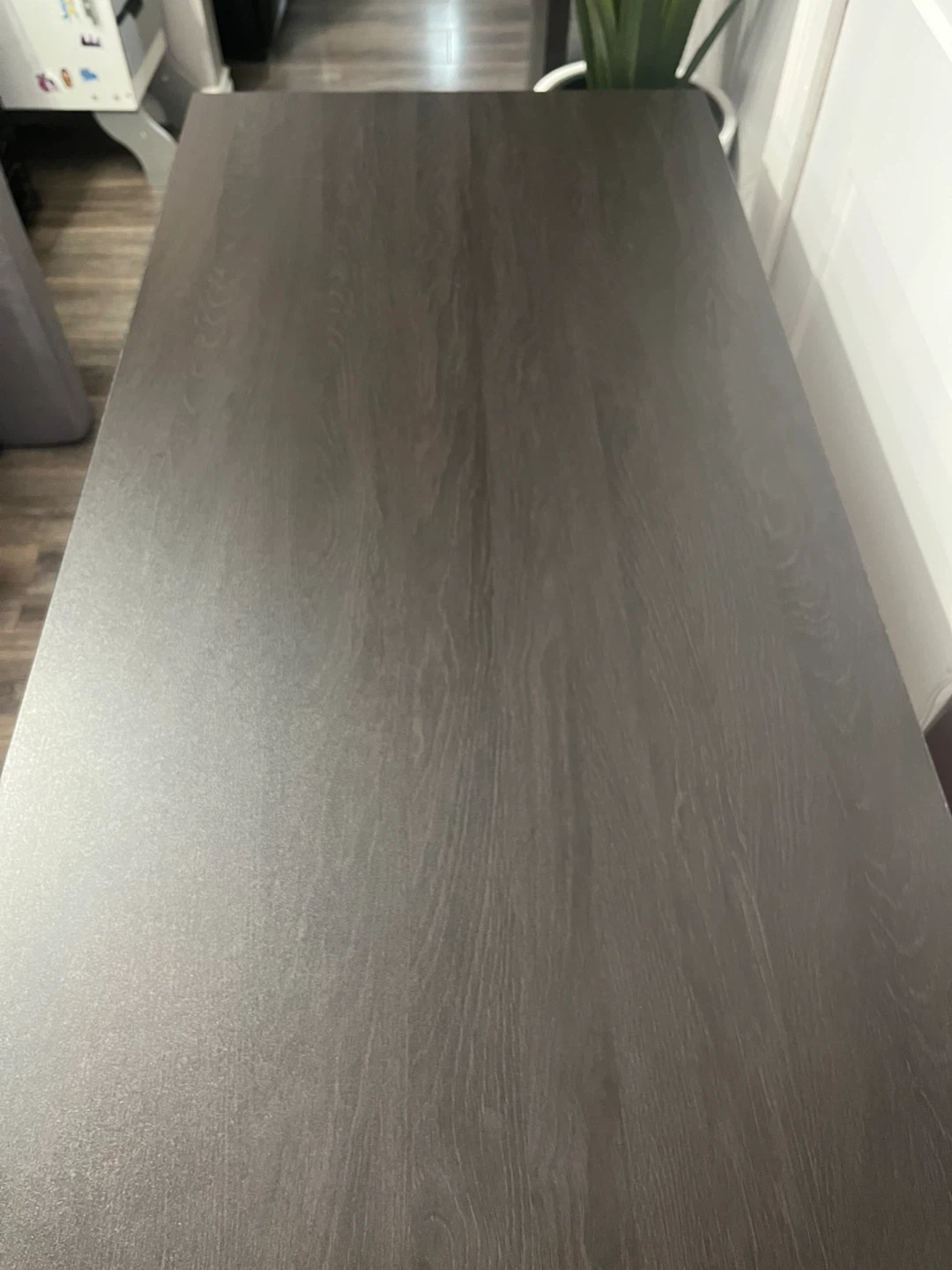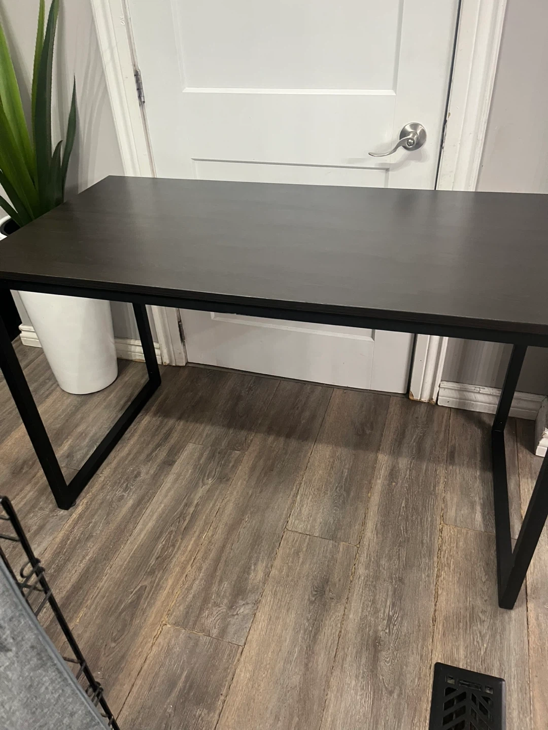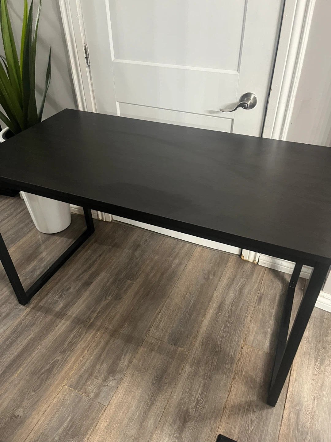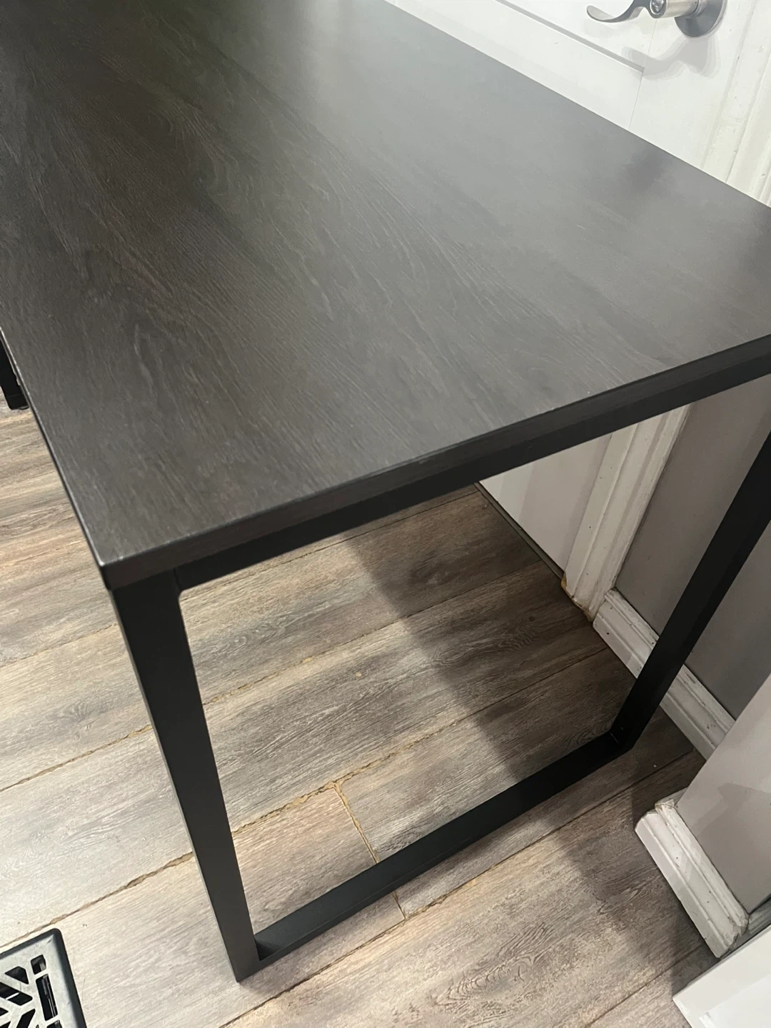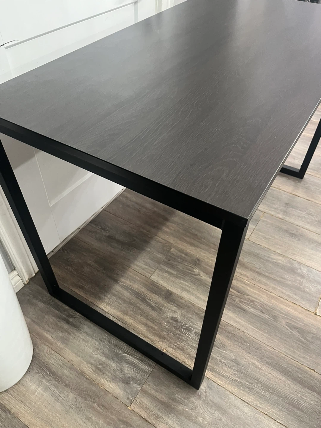 A simple and modern desk or can be used as dining table with a dark wood grain finish. It features sturdy black metal legs, offering a clean look.
