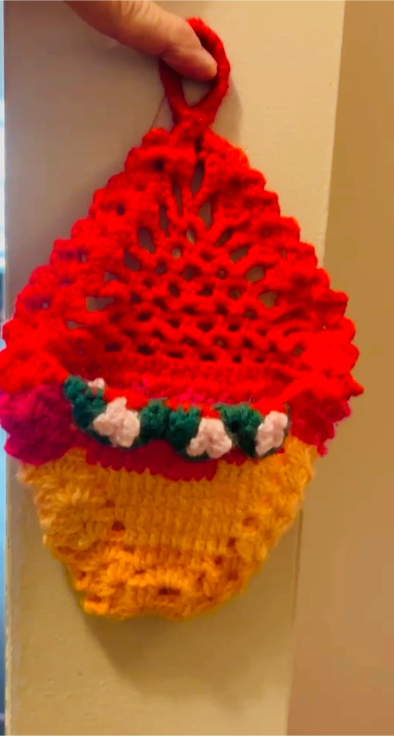 This is a vibrant, handmade crocheted potholder shaped like a cupcake. It features a red top, a pink and green decorative band, and a yellow base. It's a charming kitchen accessory.