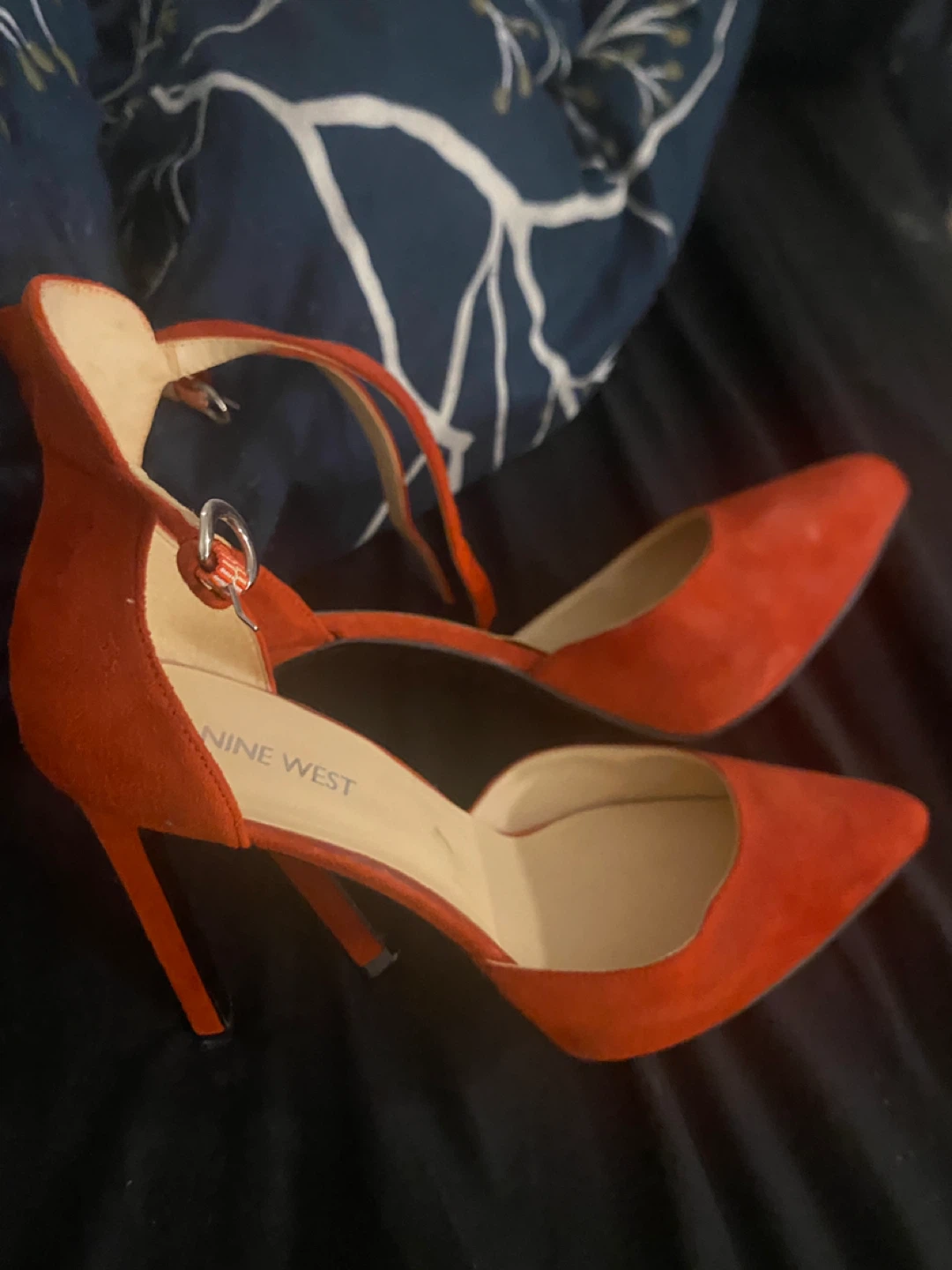 Classic Nine West heels in a vibrant red suede. These pumps feature a stylish ankle strap with buckle closure and a pointed toe. Made from suede material, they offer a sleek look.