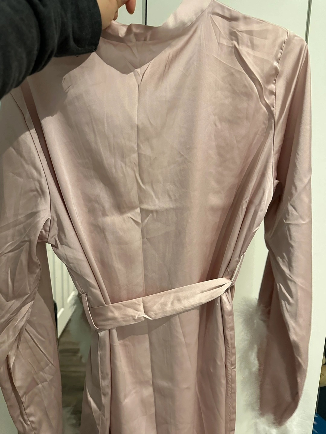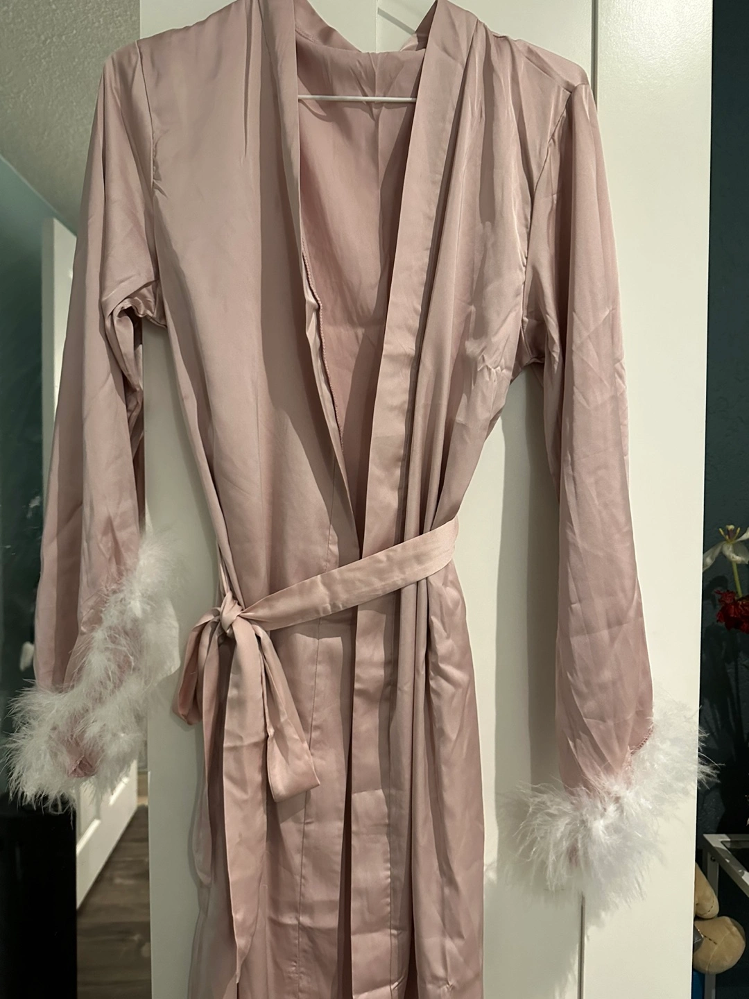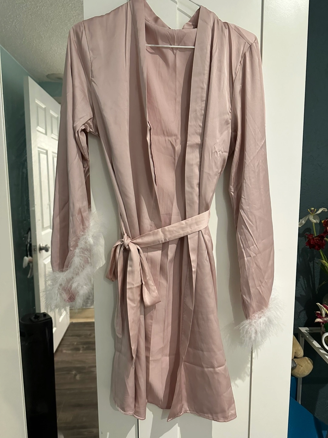 Long-sleeved satin robe. Dusty rose colour. Features feather detailing on the cuffs. Self-tie waist belt. Lightweight and comfortable.
