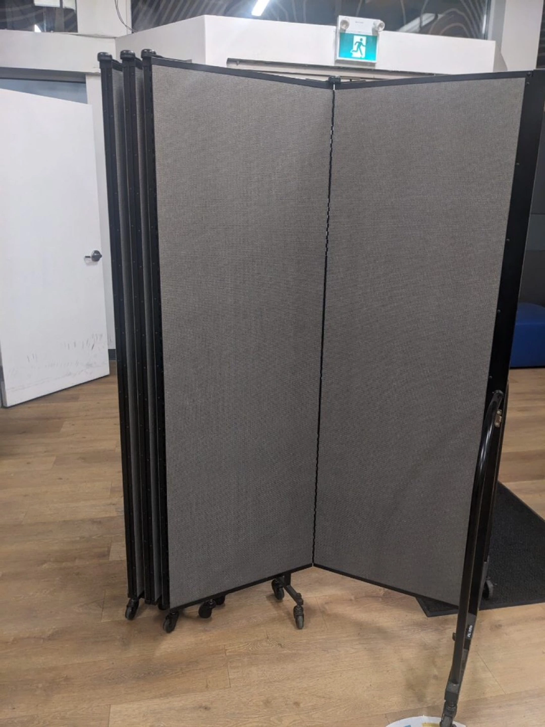 Foldable room dividers. Grey fabric panels. Black metal frame. Wheels for easy mobility. Good for office or home use. Panels fold flat for storage.