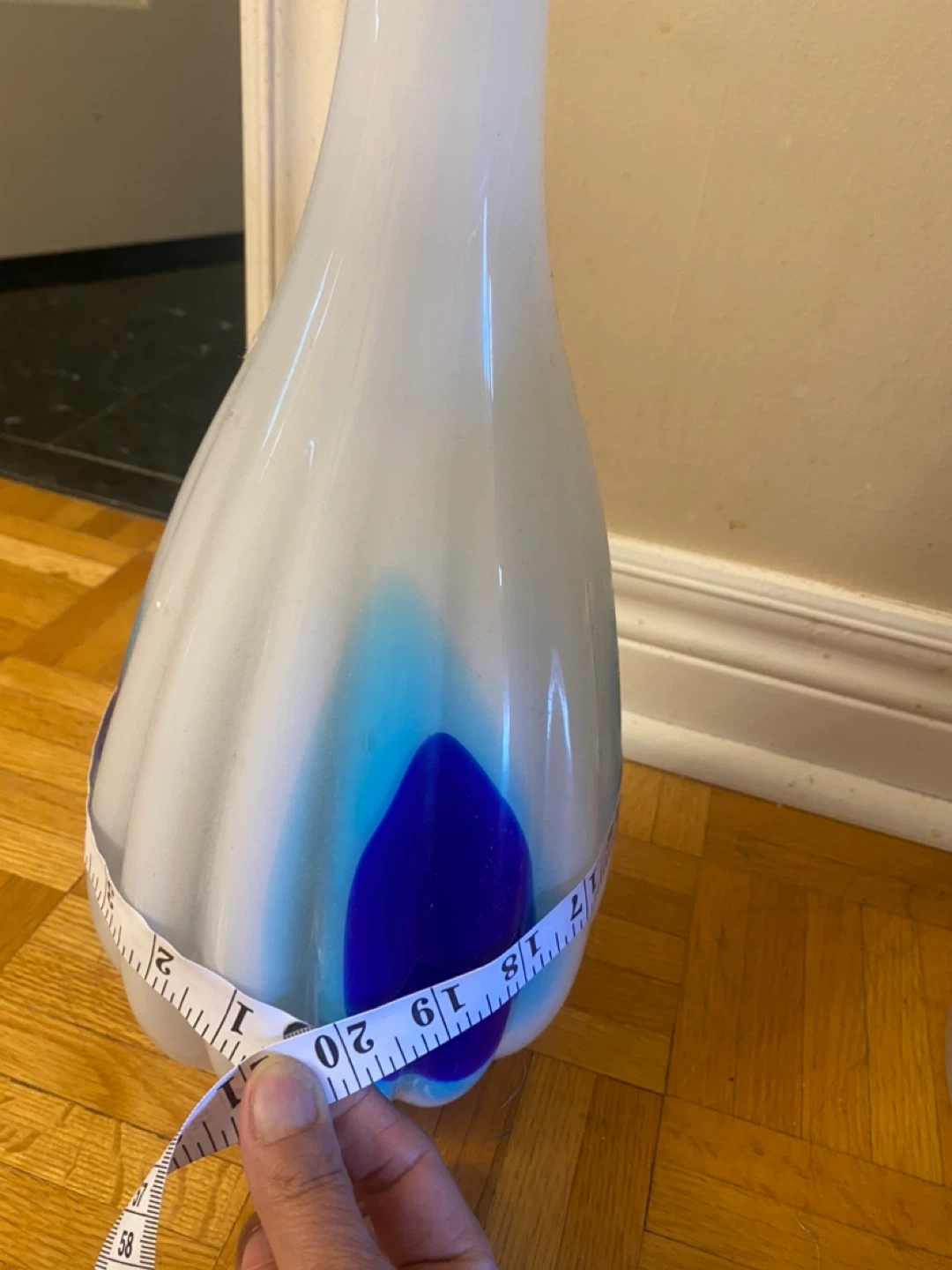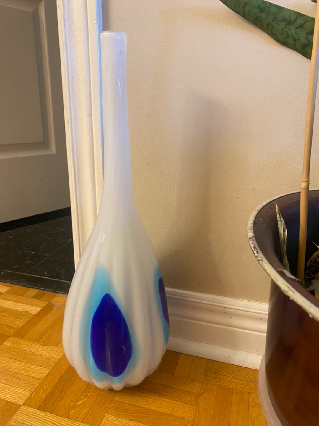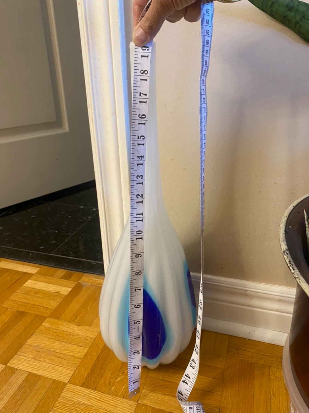 Tall white glass vase with blue accents. It's approximately 18 inches tall. The base circumference is about 20 inches.