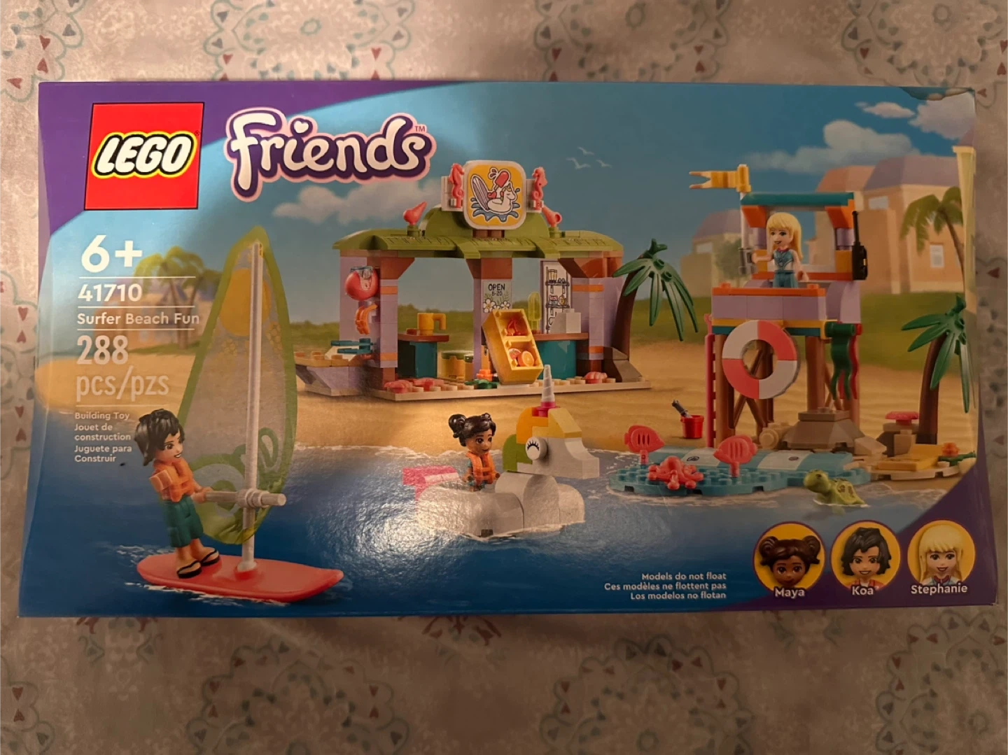 This LEGO Friends set is the Surfer Beach Fun building toy, model number 41710. It includes 288 pieces for construction. Recommended for ages 6+.