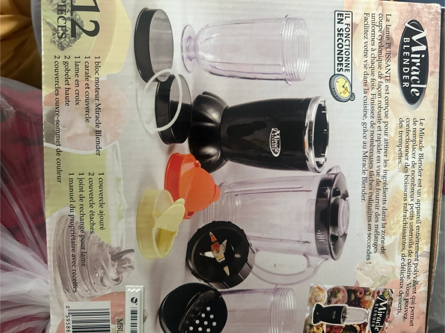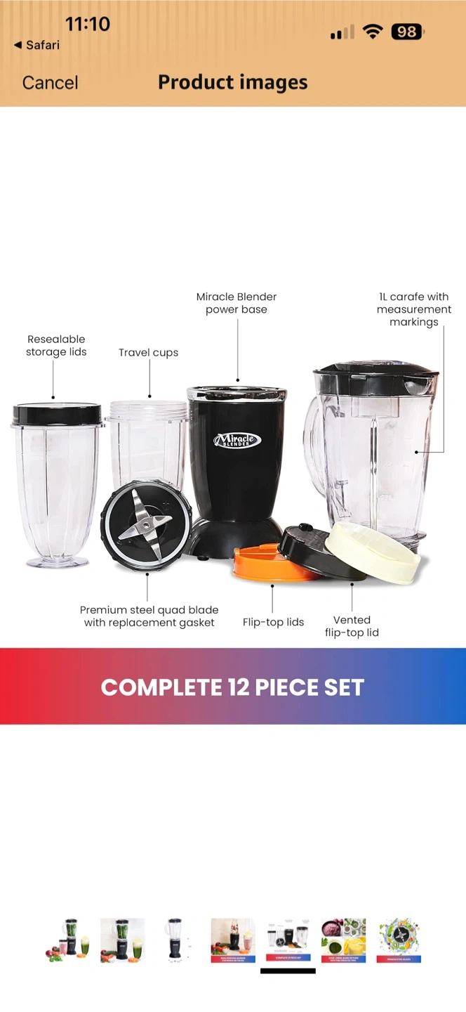 This is a 12-piece Miracle Blender set. It includes a power base, blade, two cups with lids, and a larger carafe. Works in seconds for chopping, mixing, whipping, grinding, grating, and blending.