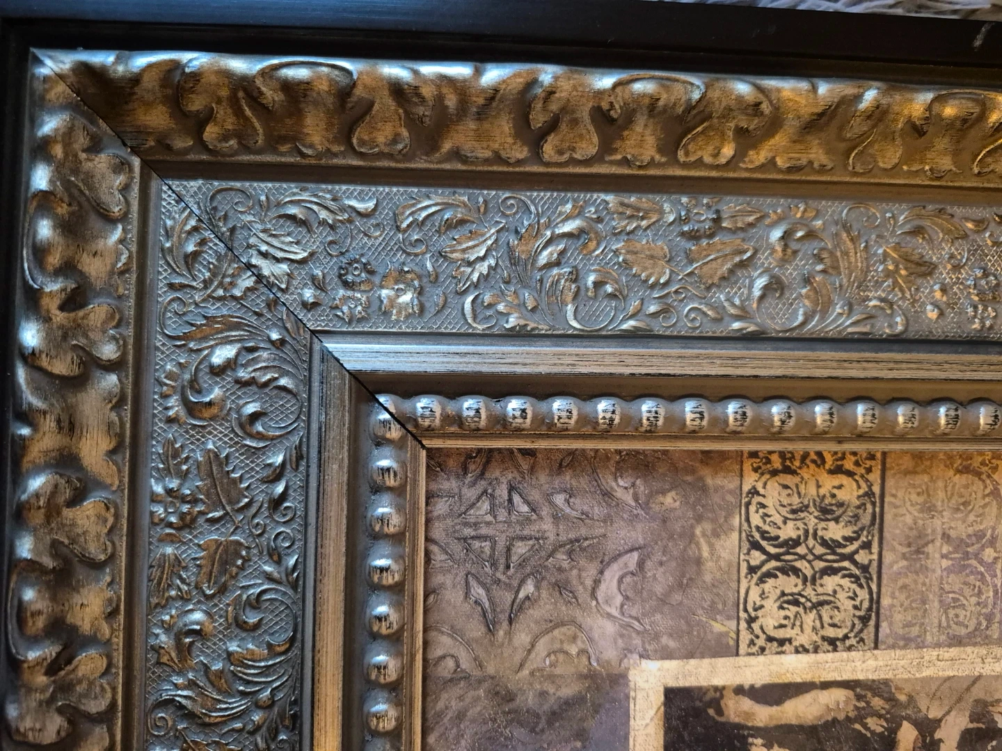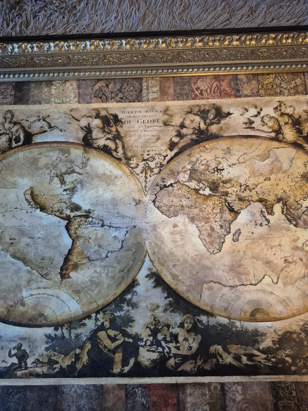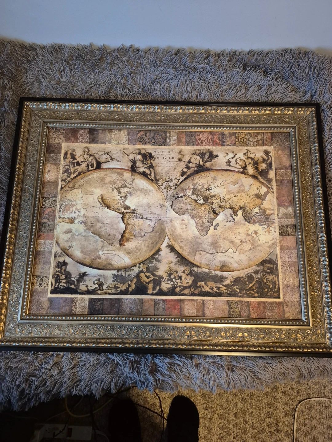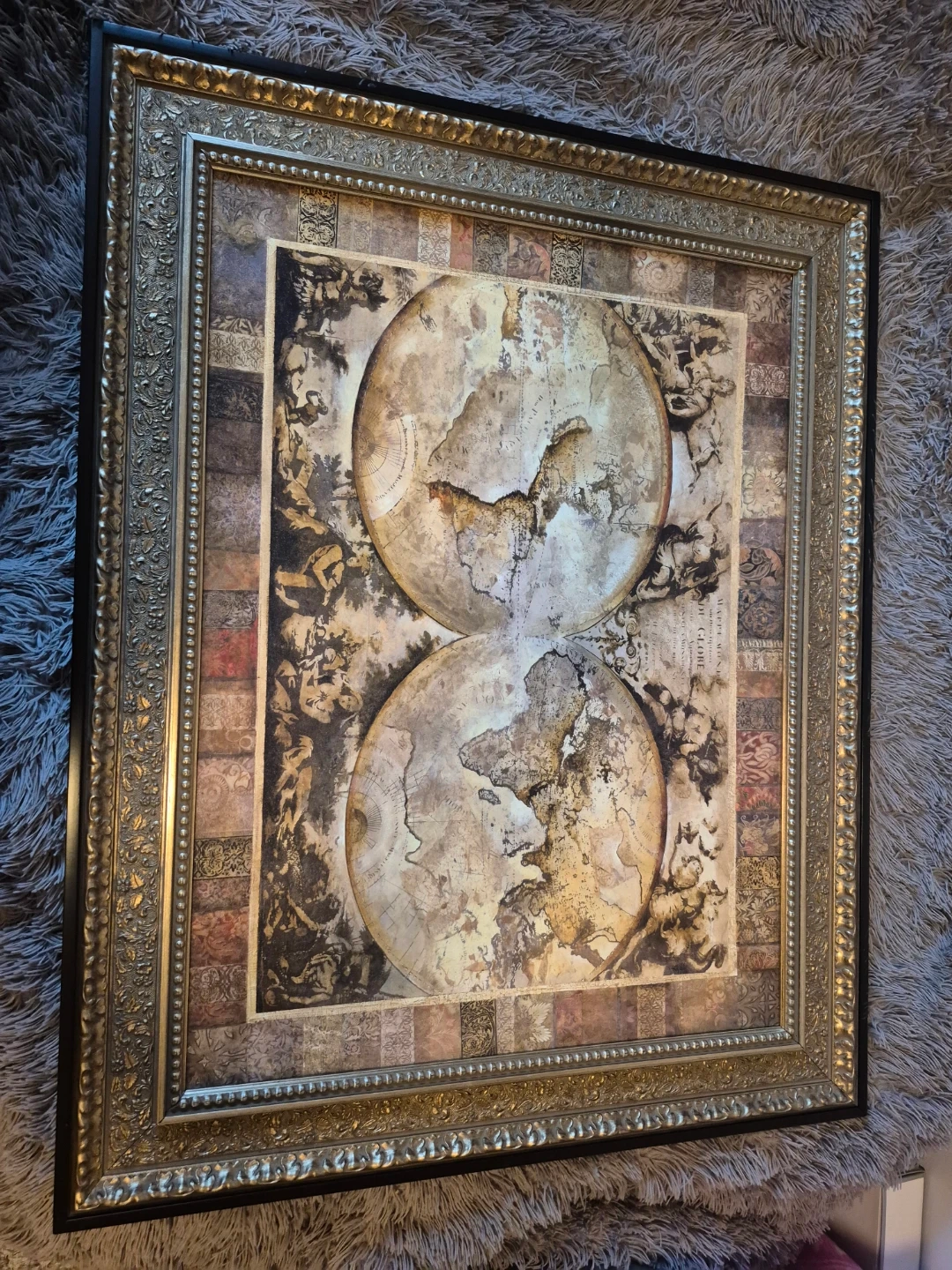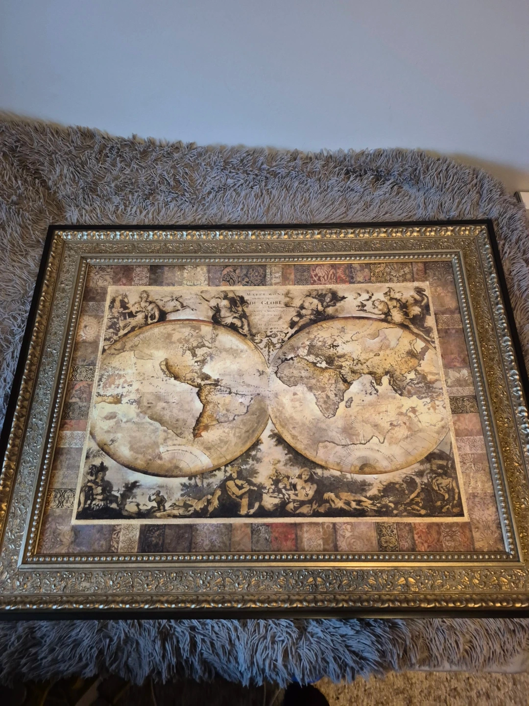 A decorative framed piece featuring a vintage-style world map. It's approximately 30 inches tall and 24 inches wide, with a ornate frame. This map would make a unique addition to any room!