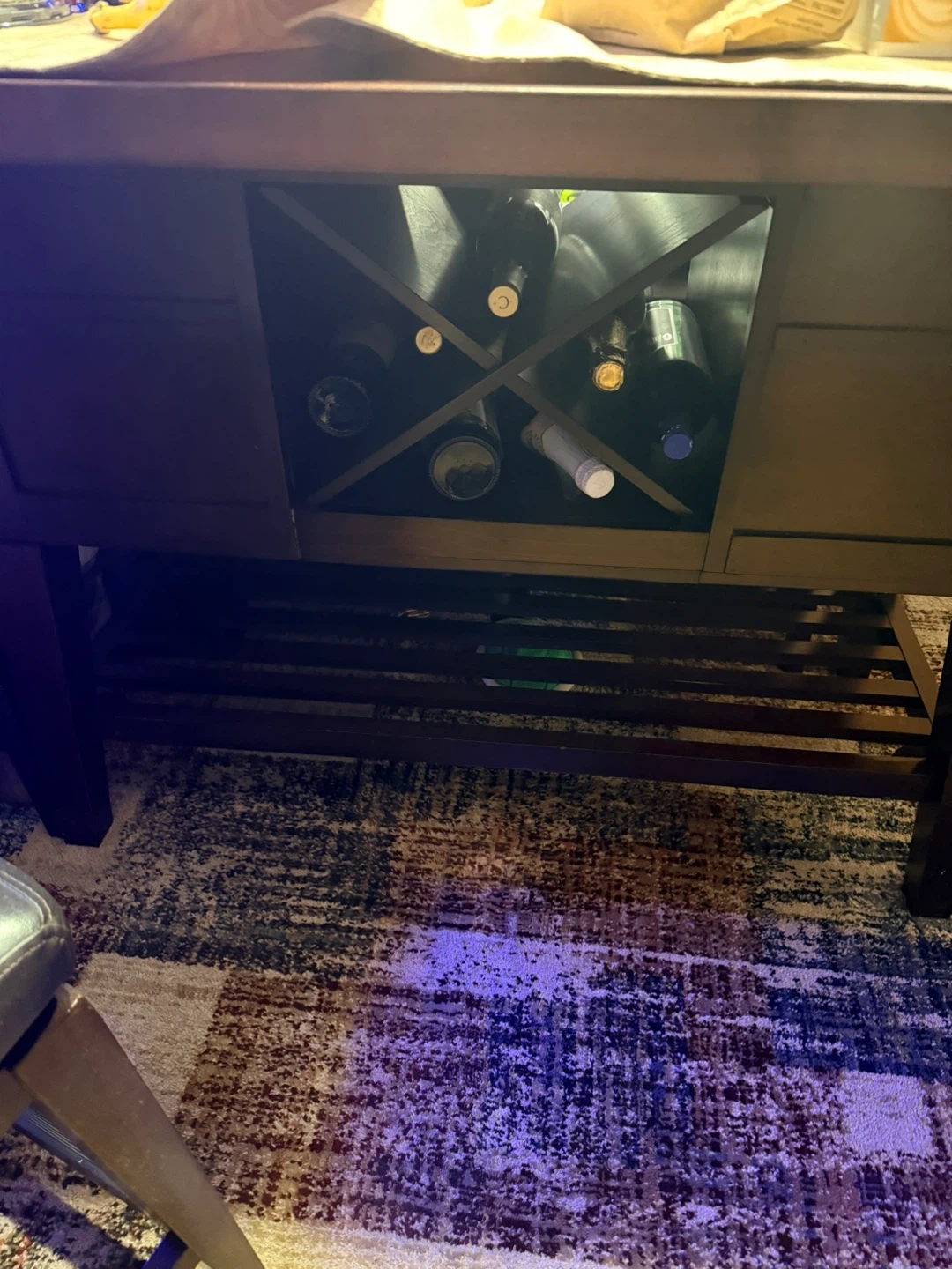I'm selling a dining table with 2 side backless bar stools and 4 bar stools, The table has a dark brown finish and includes a built-in wine rack. The bar stools are upholstered with a dark brown leather-like material. It's a great set for a kitchen or dining area!