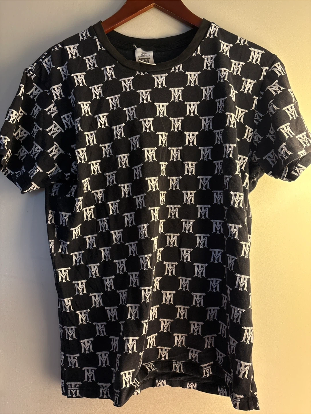 This is a black t-shirt with an all-over white "TM" monogram print. It's made in L.A. and features a crew neck and short sleeves. The material is soft cotton.