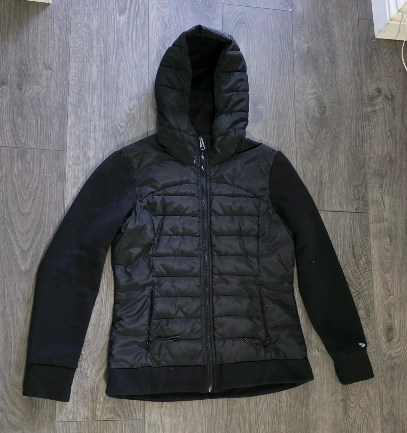 This black jacket features a full zip front and zipper pockets. It has a comfortable hood and a quilted front panel for added warmth. It's a stylish and practical layering piece.