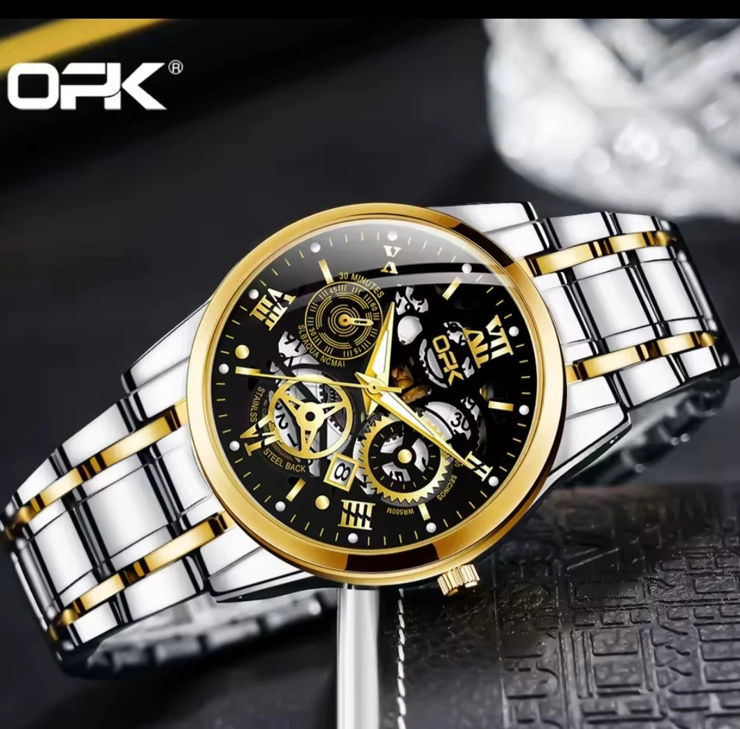 Selling a stylish OPK men's watch! It features a stainless steel band with gold accents and a unique skeleton dial. A great addition to any outfit!