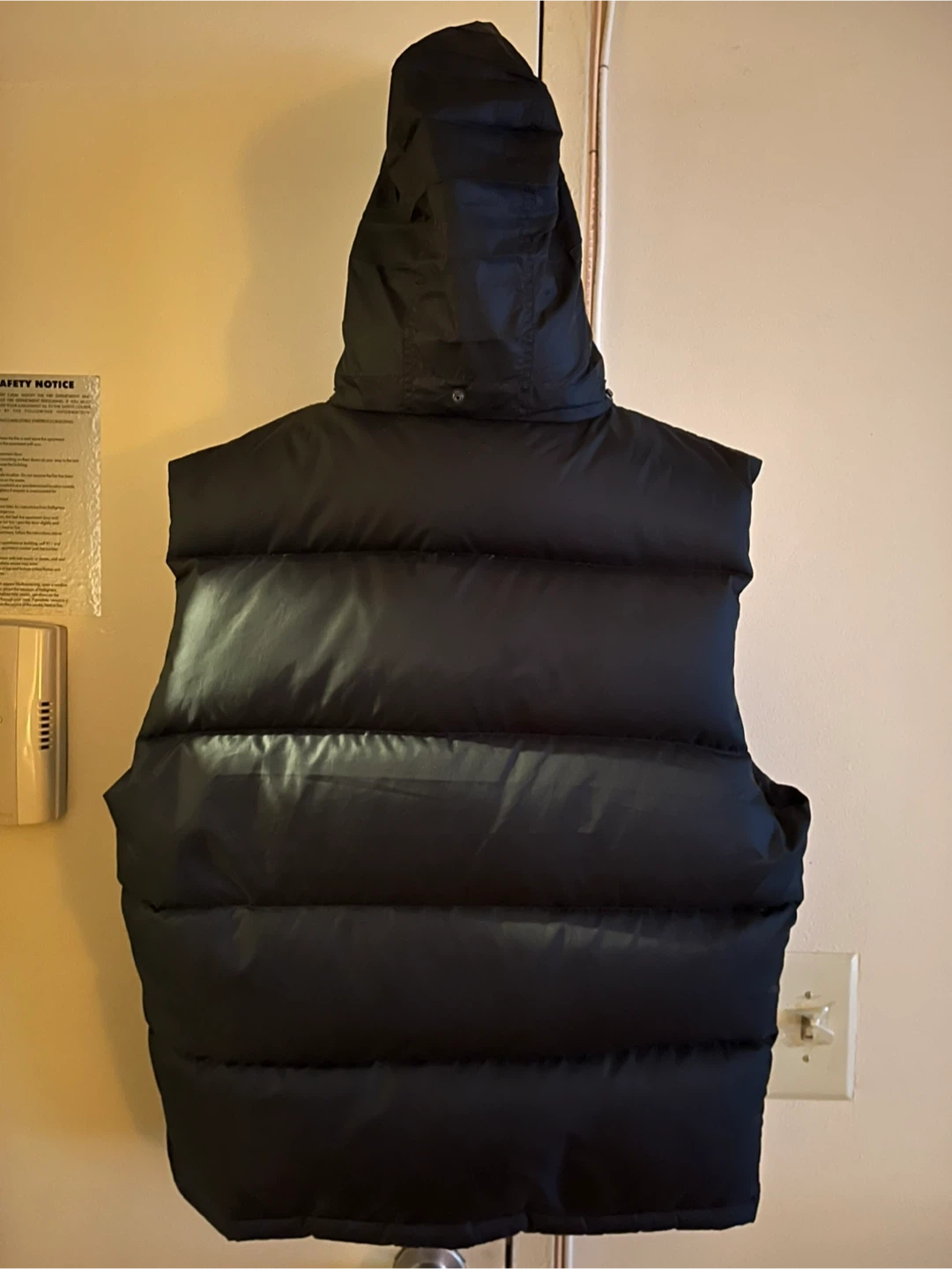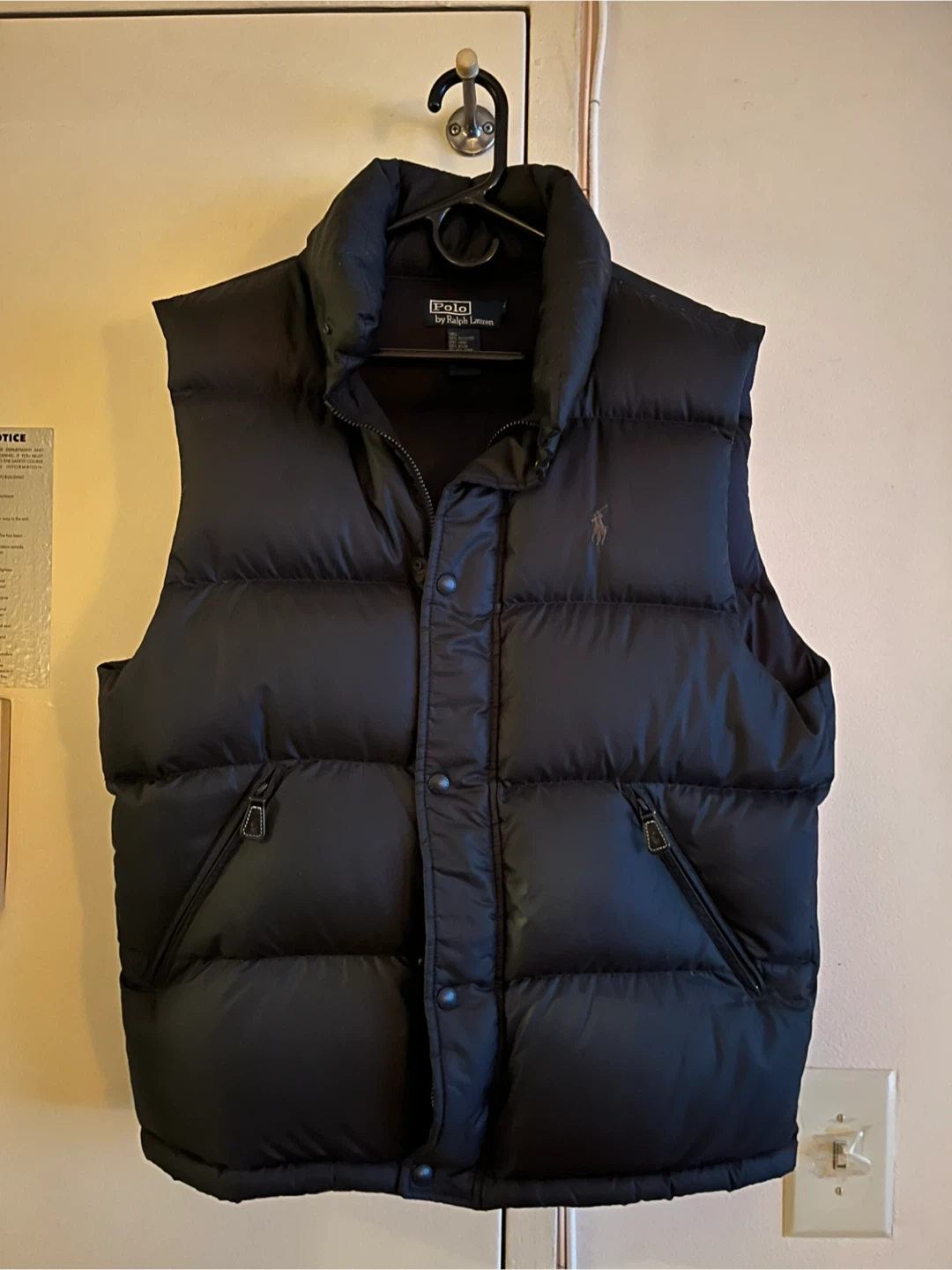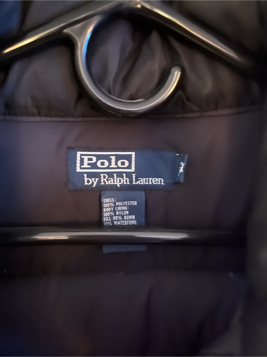 This is a black puffer vest from Polo by Ralph Lauren. It's made with a 100% polyester shell and 100% nylon body lining. The fill is 90% down and 10% waterfowl feathers. It includes a hidden rain hood. Great condition.