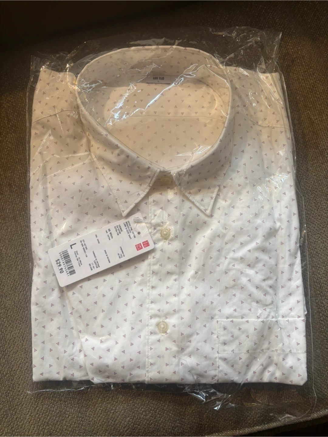 Uniqlo men's extra fine cotton button-down shirt. It's a size large in white with a small geometric print. This shirt is still in its original packaging.