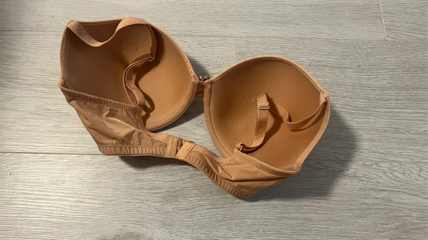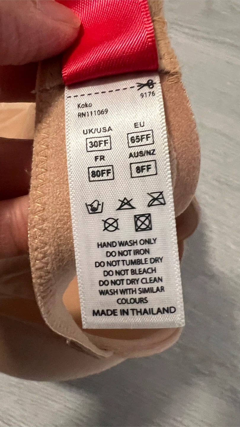 This is a beige balconette bra by Cleo by Panache. It's a size 30FF in UK sizing. Hand wash only, do not tumble dry, bleach, or dry clean.