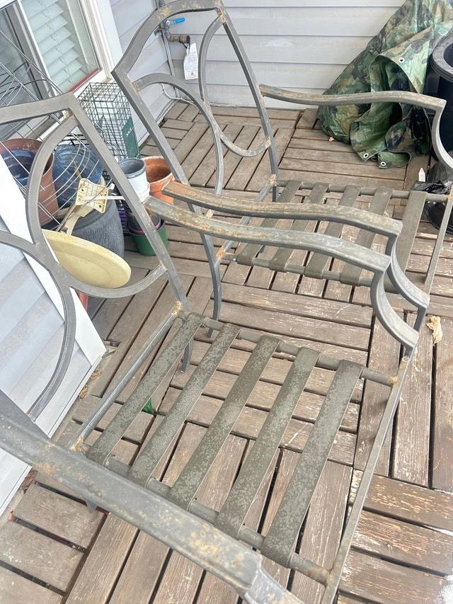 4 metal patio chairs, with cushions. Cushions are one piece, and velcro on at top. Very comfortable, 2 chairs like new, 2 need cleaning. All cushions in very good condition. Pickup in Kanata, near Moodie Dr & Queensway. No delivery.
