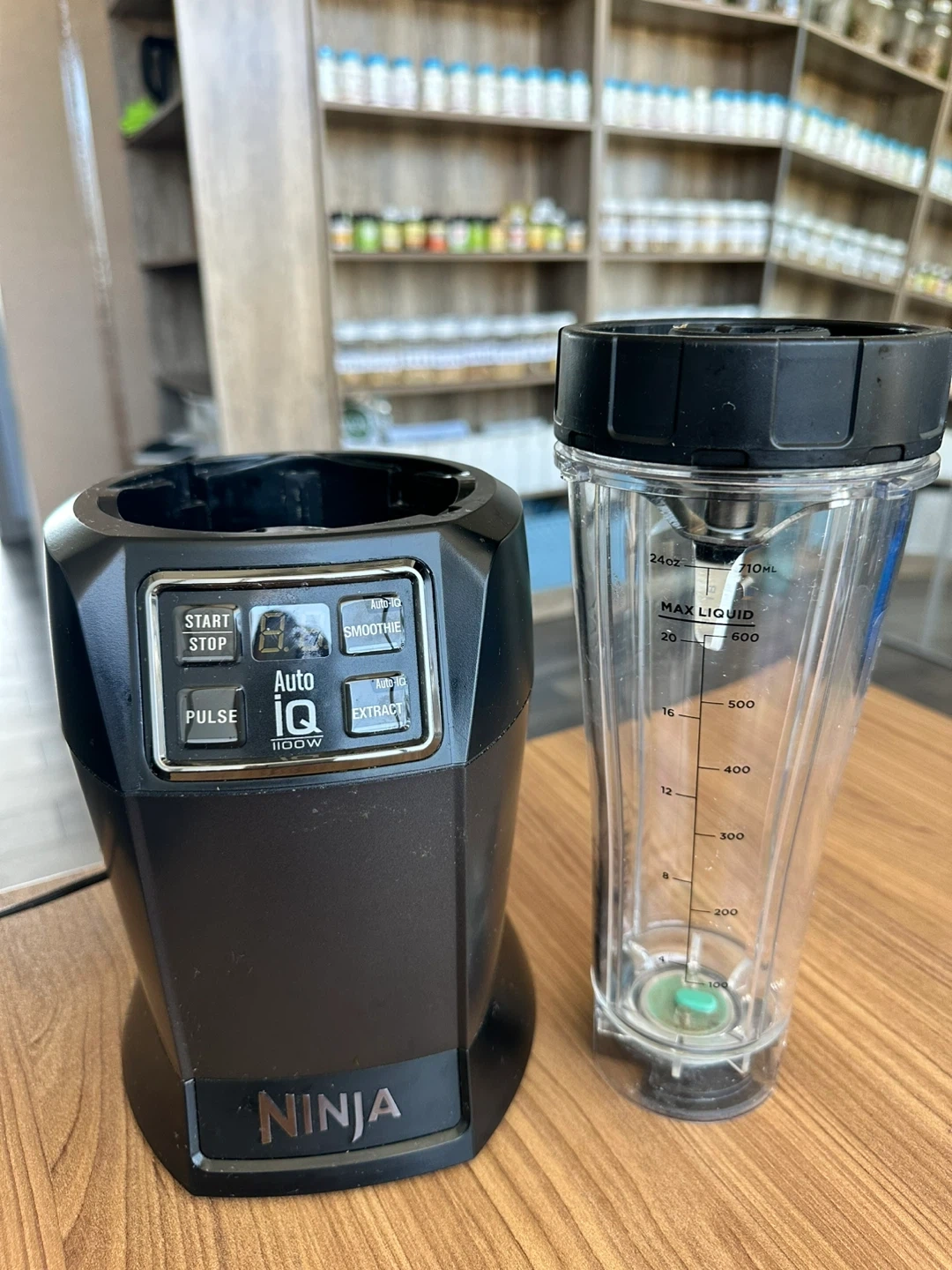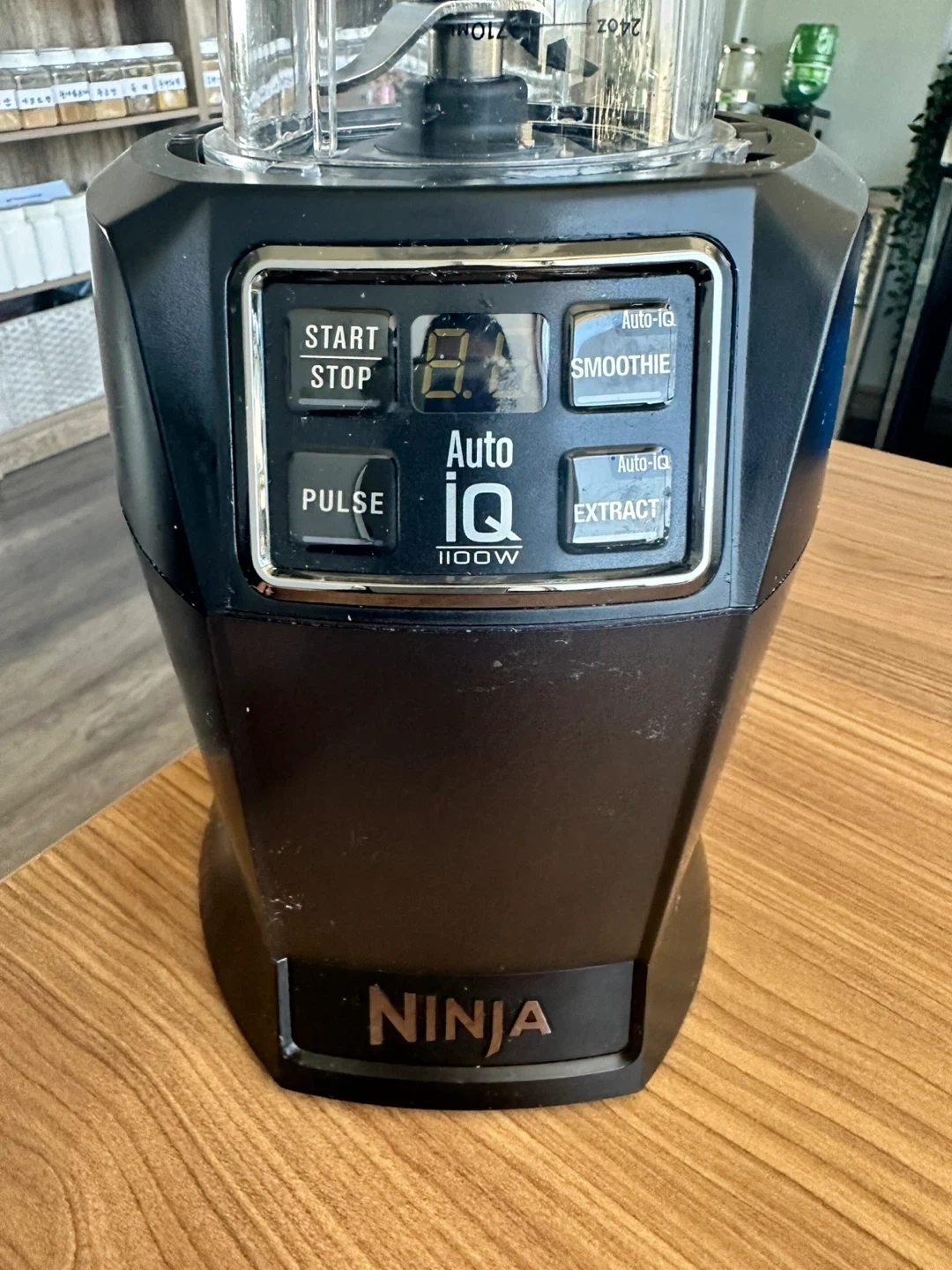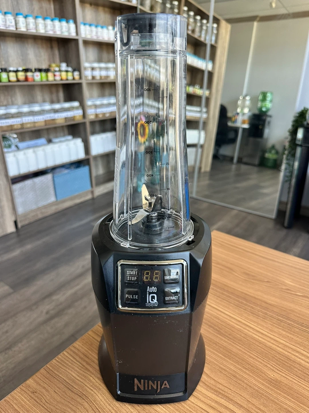 This Ninja personal blender features Auto IQ technology with smoothie and extract settings. It includes a 710ml cup with measurement markings. It's ready for your next smoothie creation!