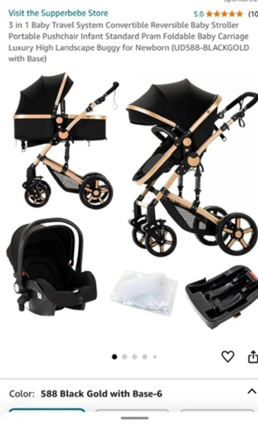 Selling a Supperbebe 3 in 1 Baby Travel System in a stylish black gold color! This convertible and reversible baby stroller is perfect as a portable pushchair for infants. It's a standard pram that's foldable for easy storage and transport. The luxury high landscape buggy is designed for newborns and includes a base. Everything included