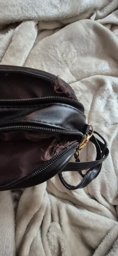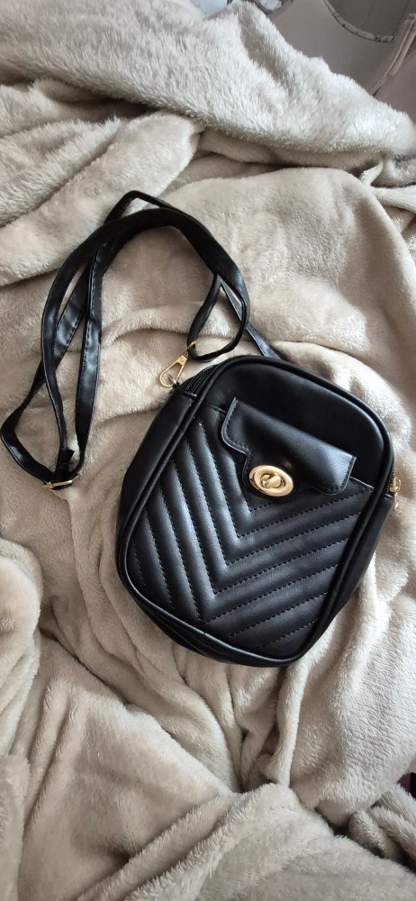 Cute black crossbody bag. Features a quilted design and gold-toned hardware. Adjustable strap. Small size, perfect for essentials. Fabric got caught in the zipper and needs to be sewn back in.