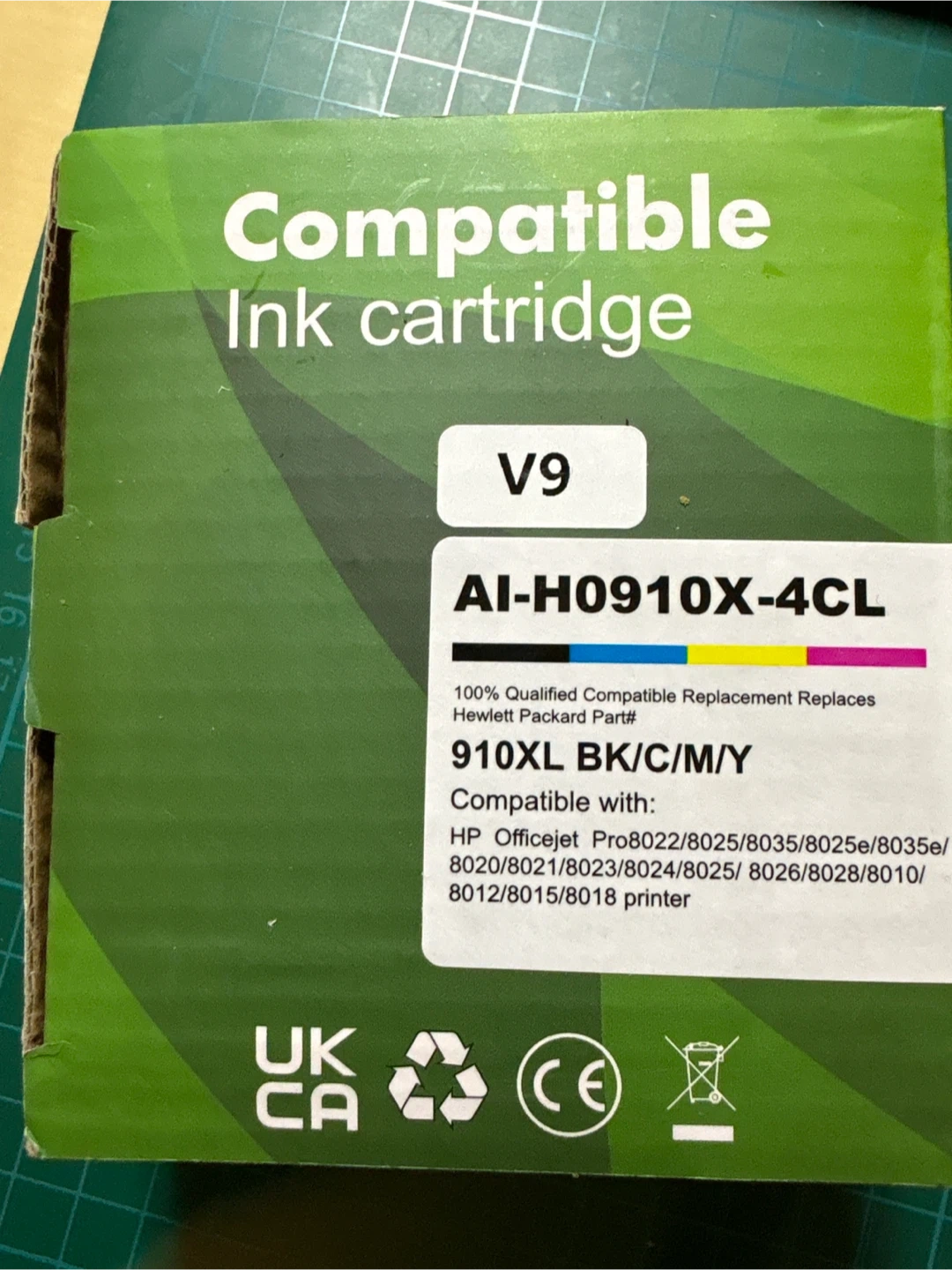 This is a compatible ink cartridge model AI-H0910X-4CL for HP printers. It's a 910XL BK/C/M/Y multipack. This cartridge is compatible with various HP Officejet Pro models.