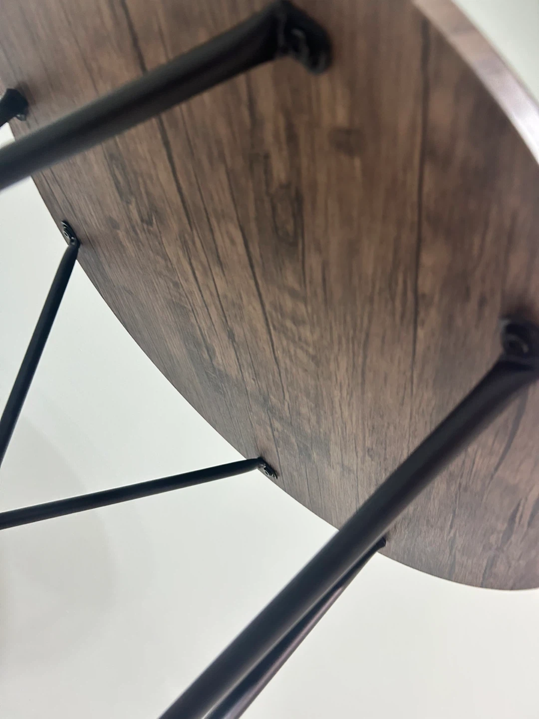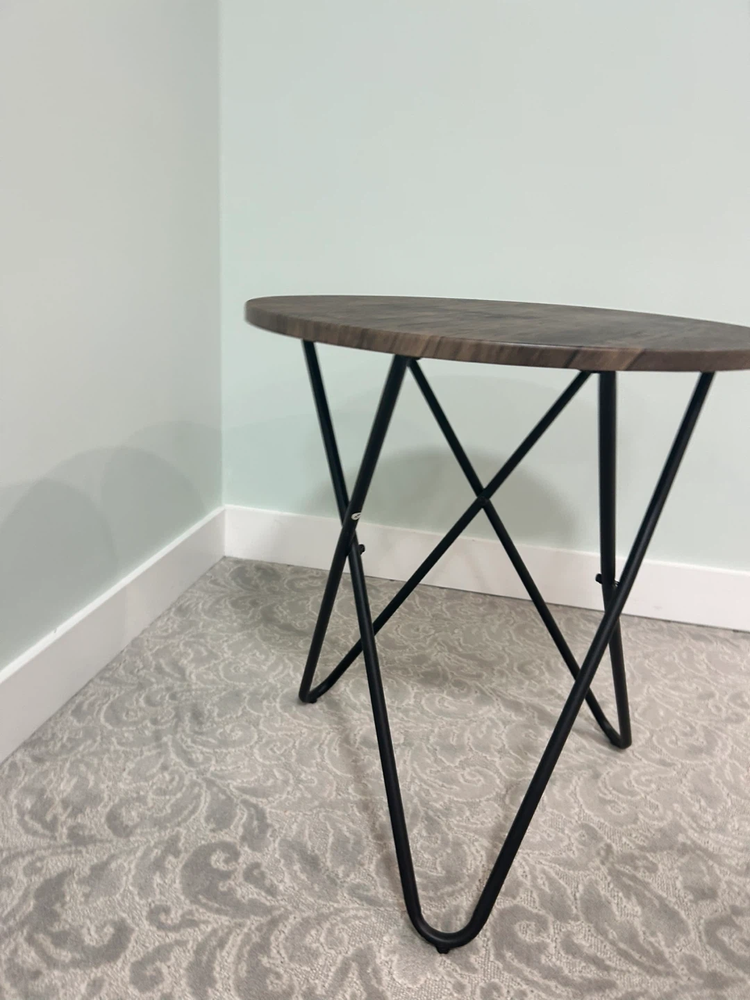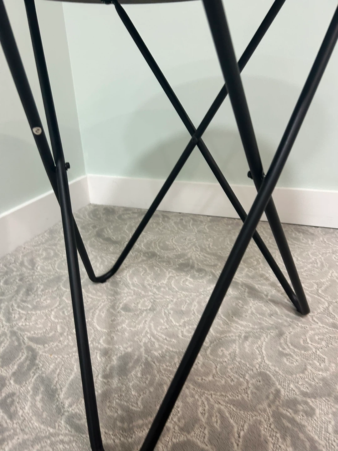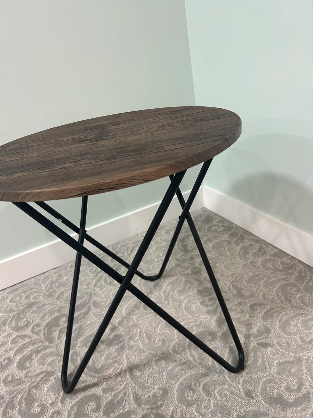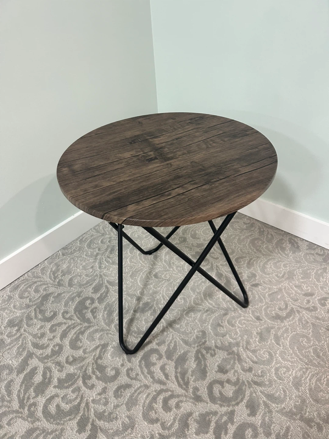 Price is negotiable. This handy side table features a wood-look top and a collapsible black metal base. It's easy to set up and take down. This table is useful for placing drinks, snacks, or small decorative items. Measures approximately 18 inches in height.