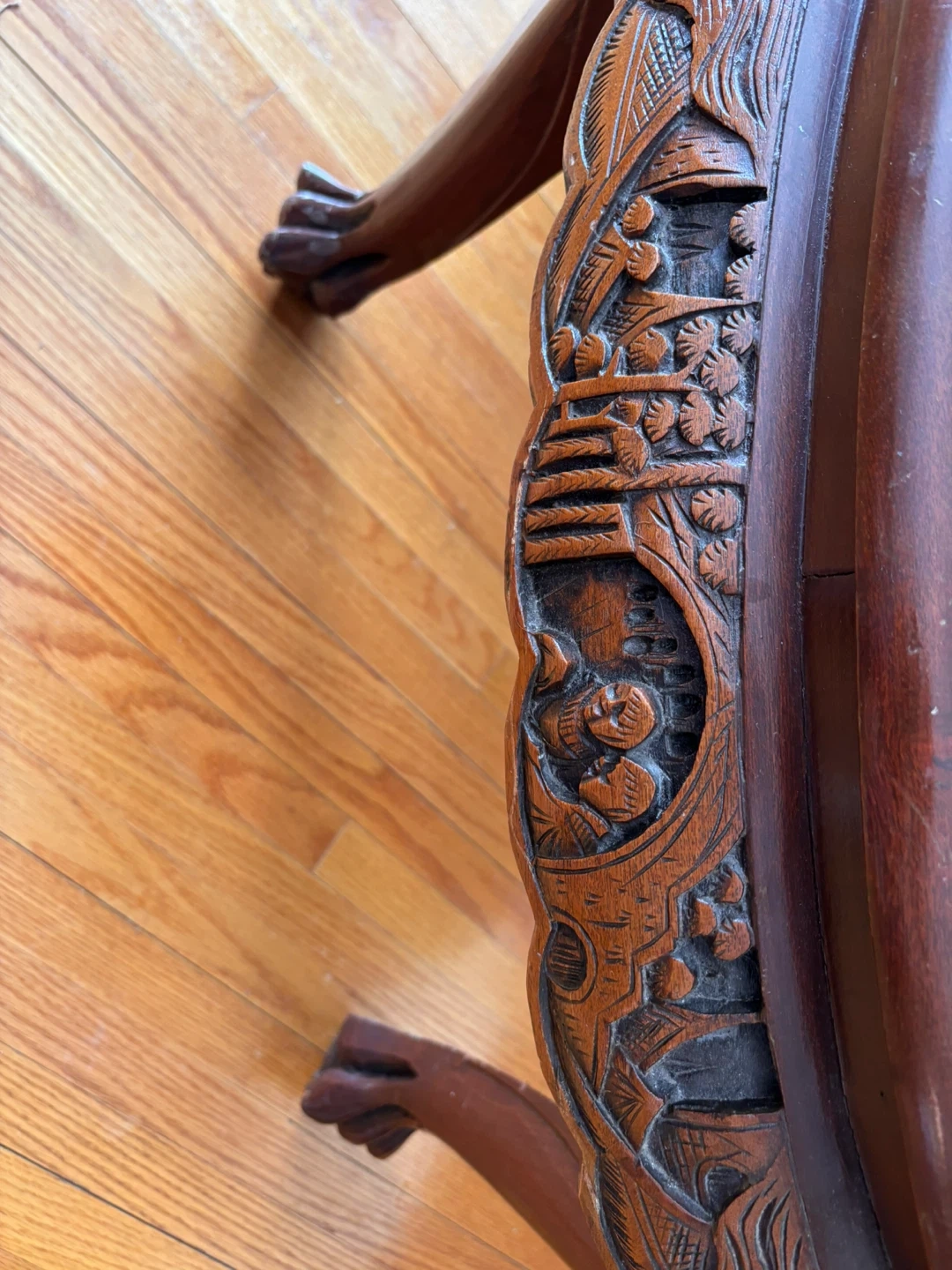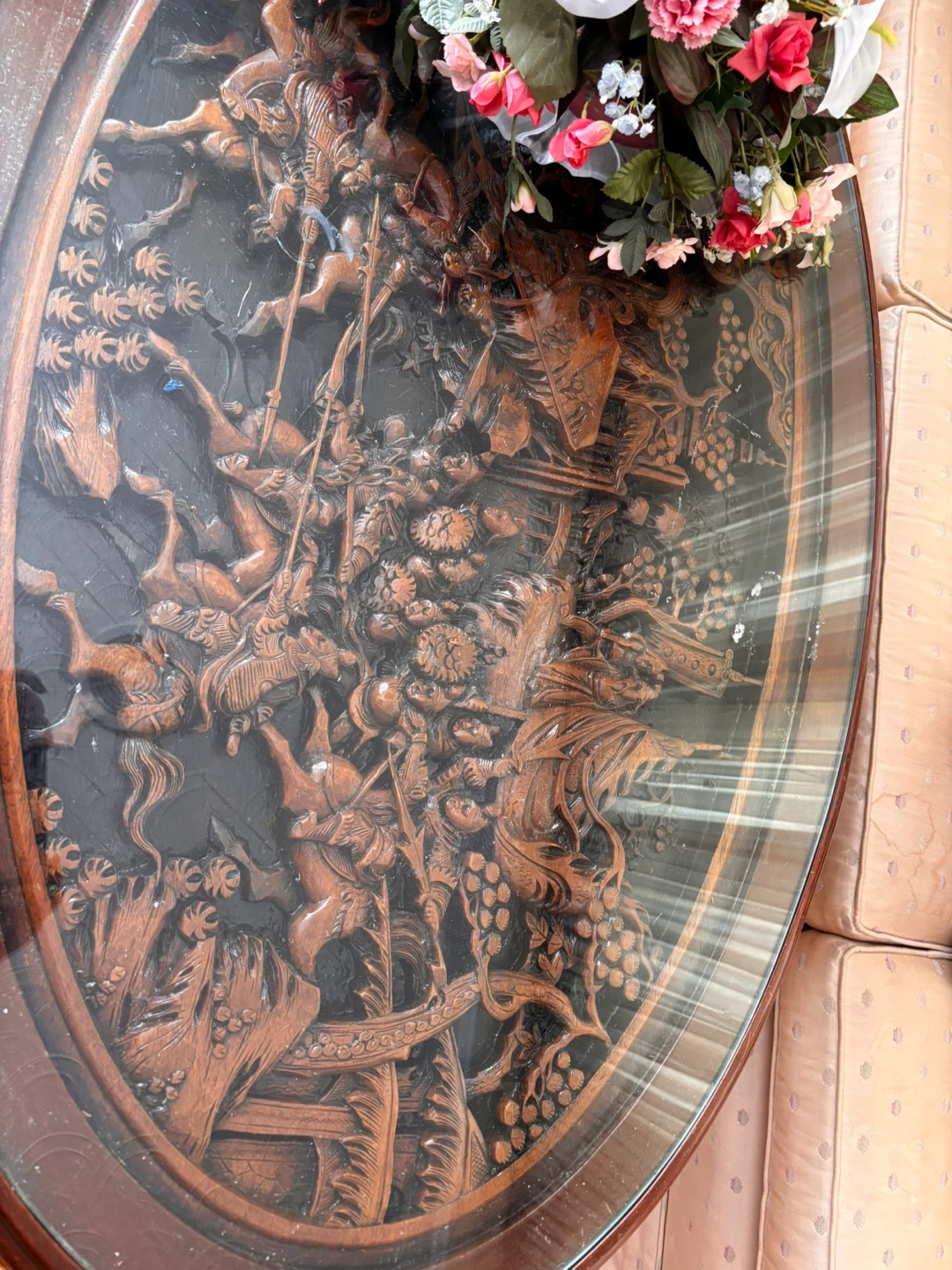 This oval coffee table features a detailed carved wooden base with intricate scenes. It has a protective glass top that rests over the carved design. It's a unique statement piece for your living room.