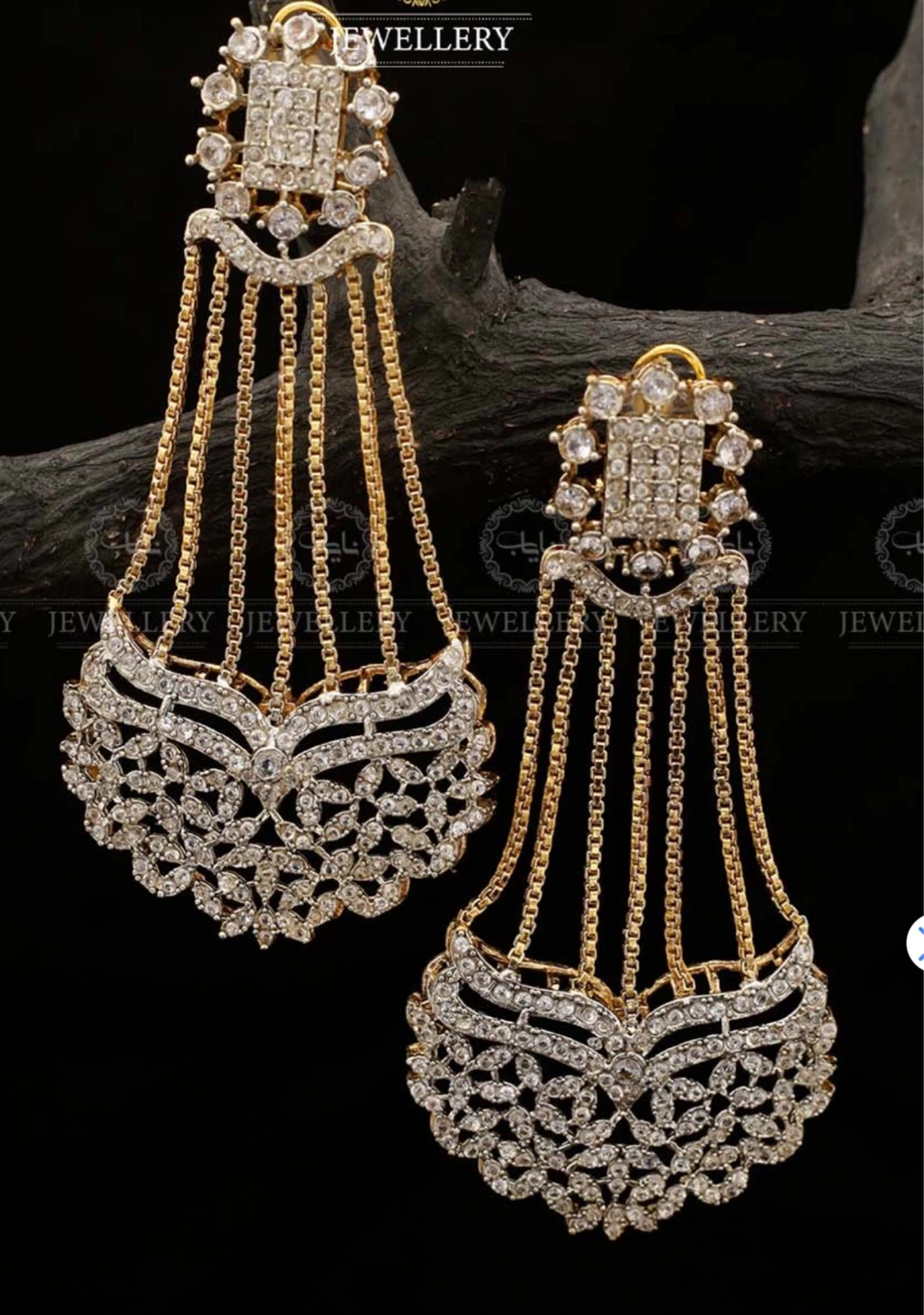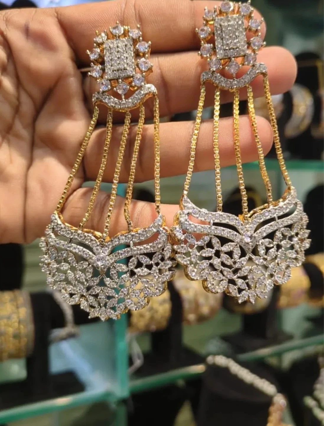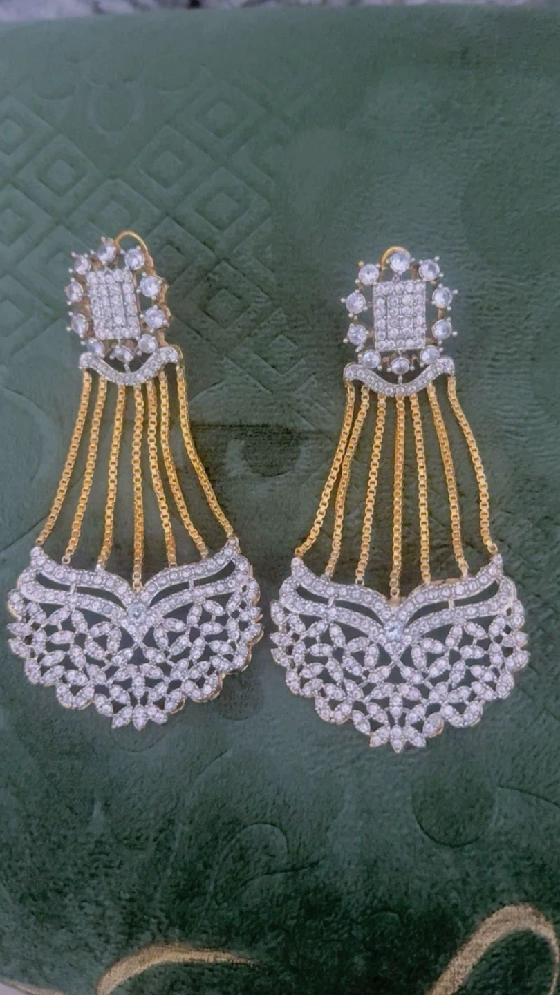 These are stunning gold-toned drop earrings adorned with clear stones. They feature an intricate dangling design with multiple chains and a decorative base. Perfect for adding a touch of sparkle to any formal occasion!