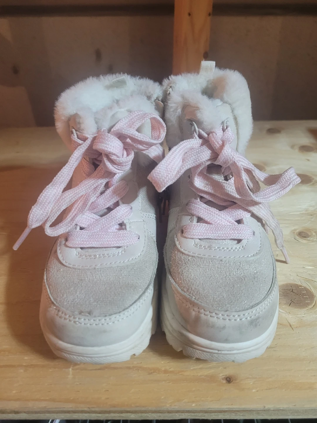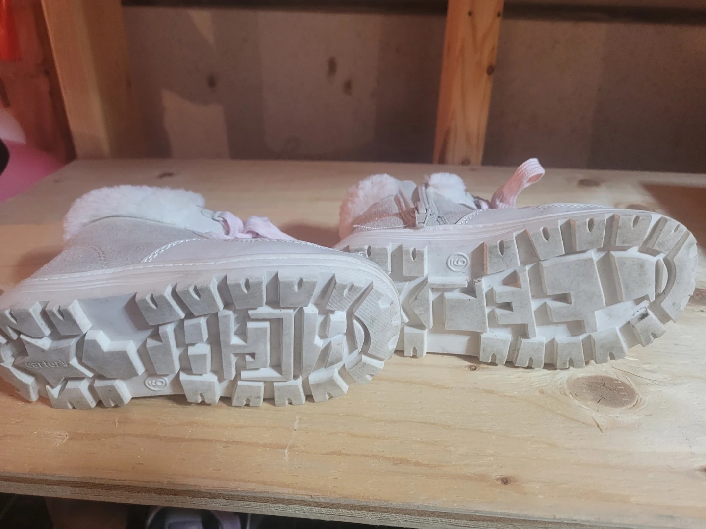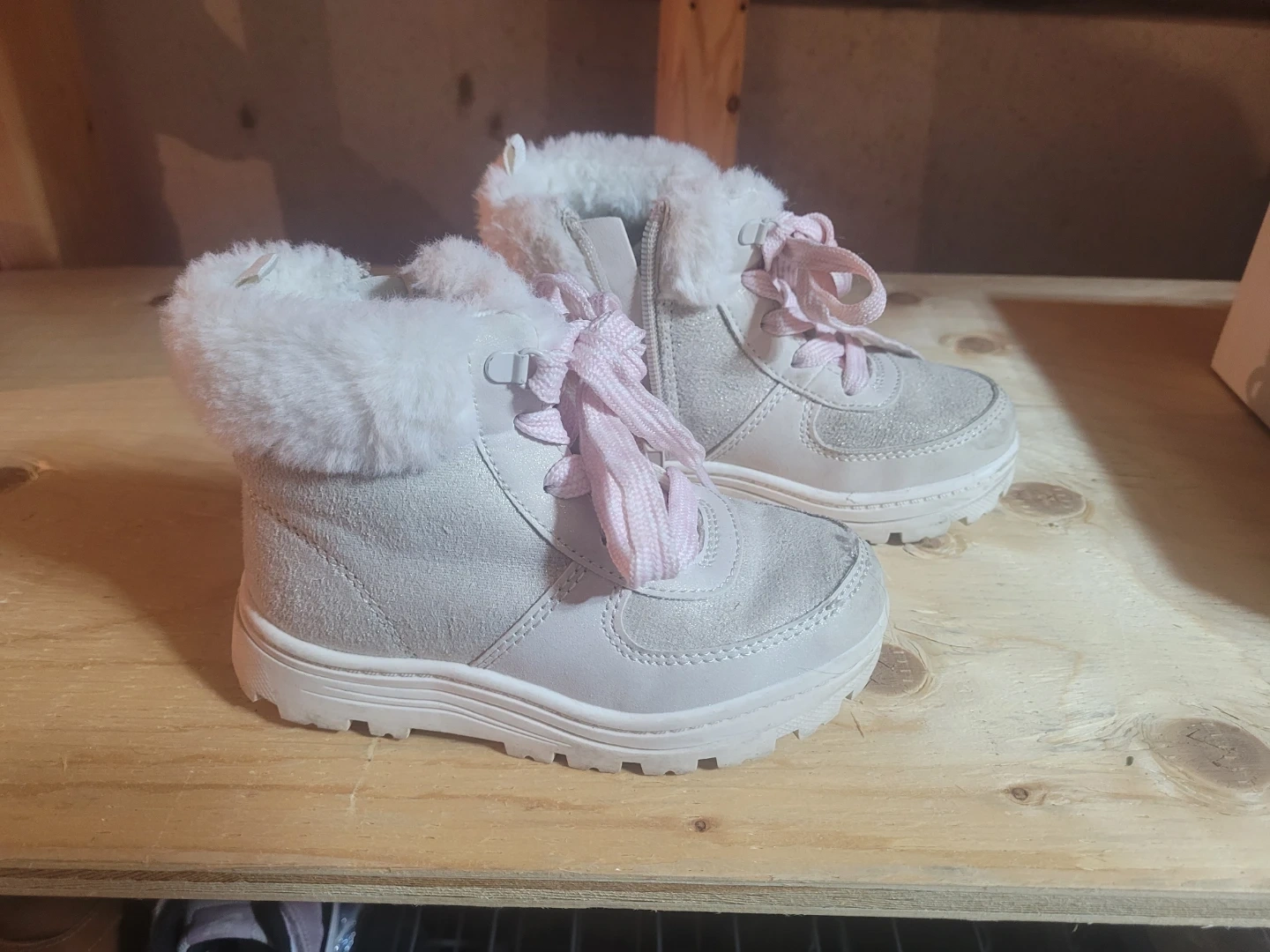 Here are a pair of Carter's toddler winter boots in a size 9. They're in good condition and ready for some winter fun! They feature sparkly white outside a soft, furry lining and pink laces.