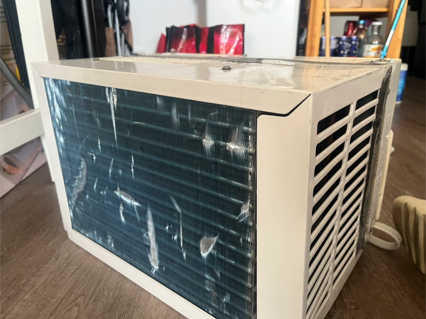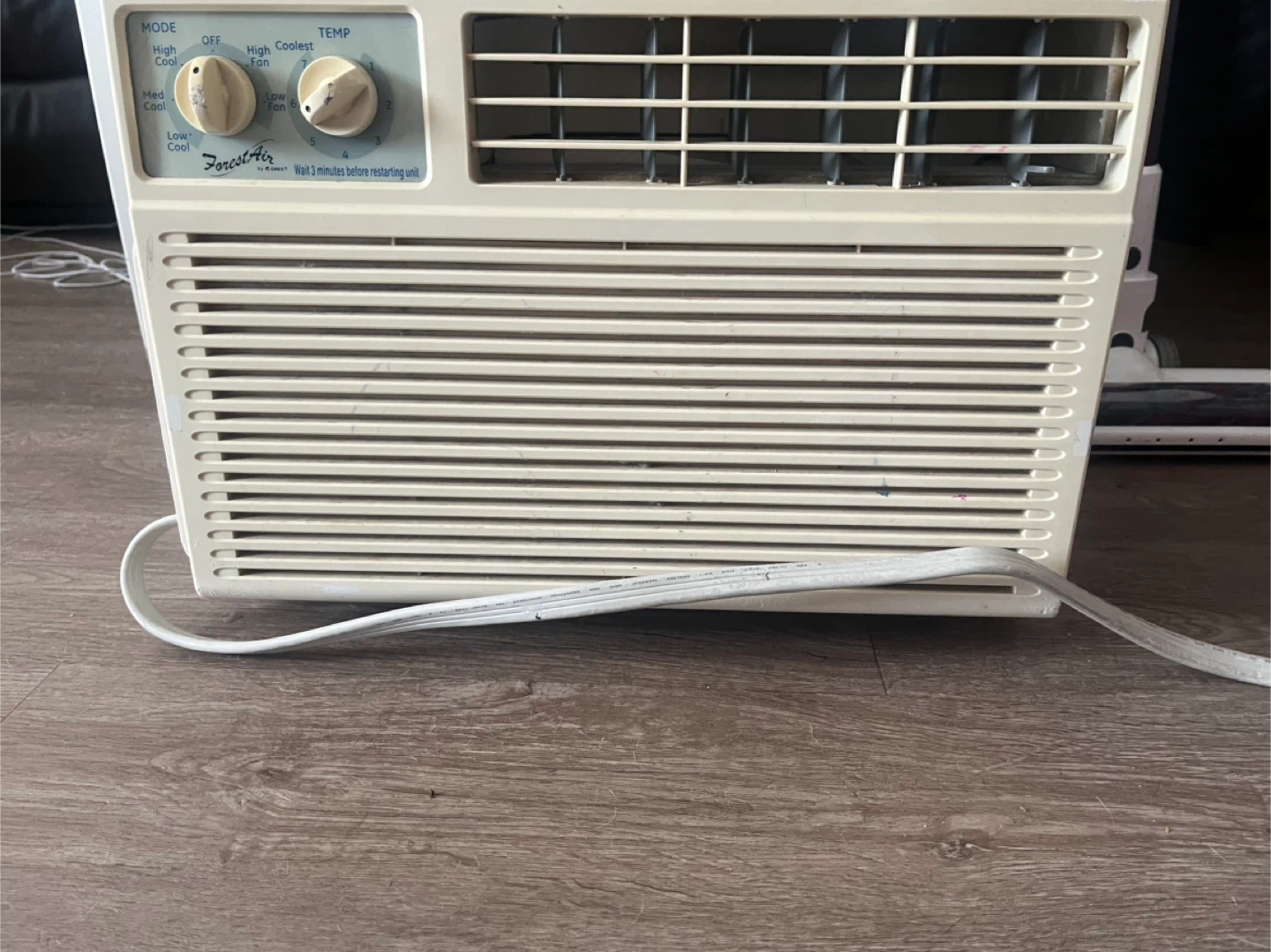 Forest Air window air conditioner with multiple settings. Unit has a white exterior and comes with a power cord. Some tape residue is visible on the back.
