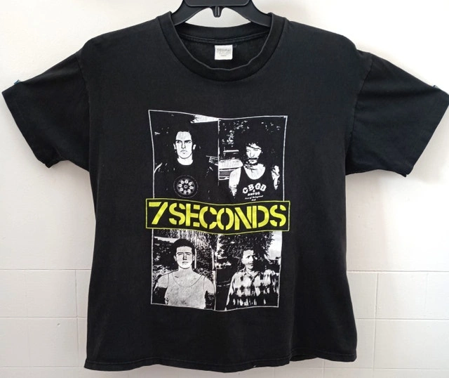 Hard-to-find vintage 1990 7 Seconds world tour shirt with front and back print in great used shape with minimal fading. The front print has some ink cracking, but no holes or rips. It's a size large (measurements shown in photo) and the tag reads: Funstuff N.Y. Made in U.S.A. Available for a safe, public meet-up in downtown Kitchener.