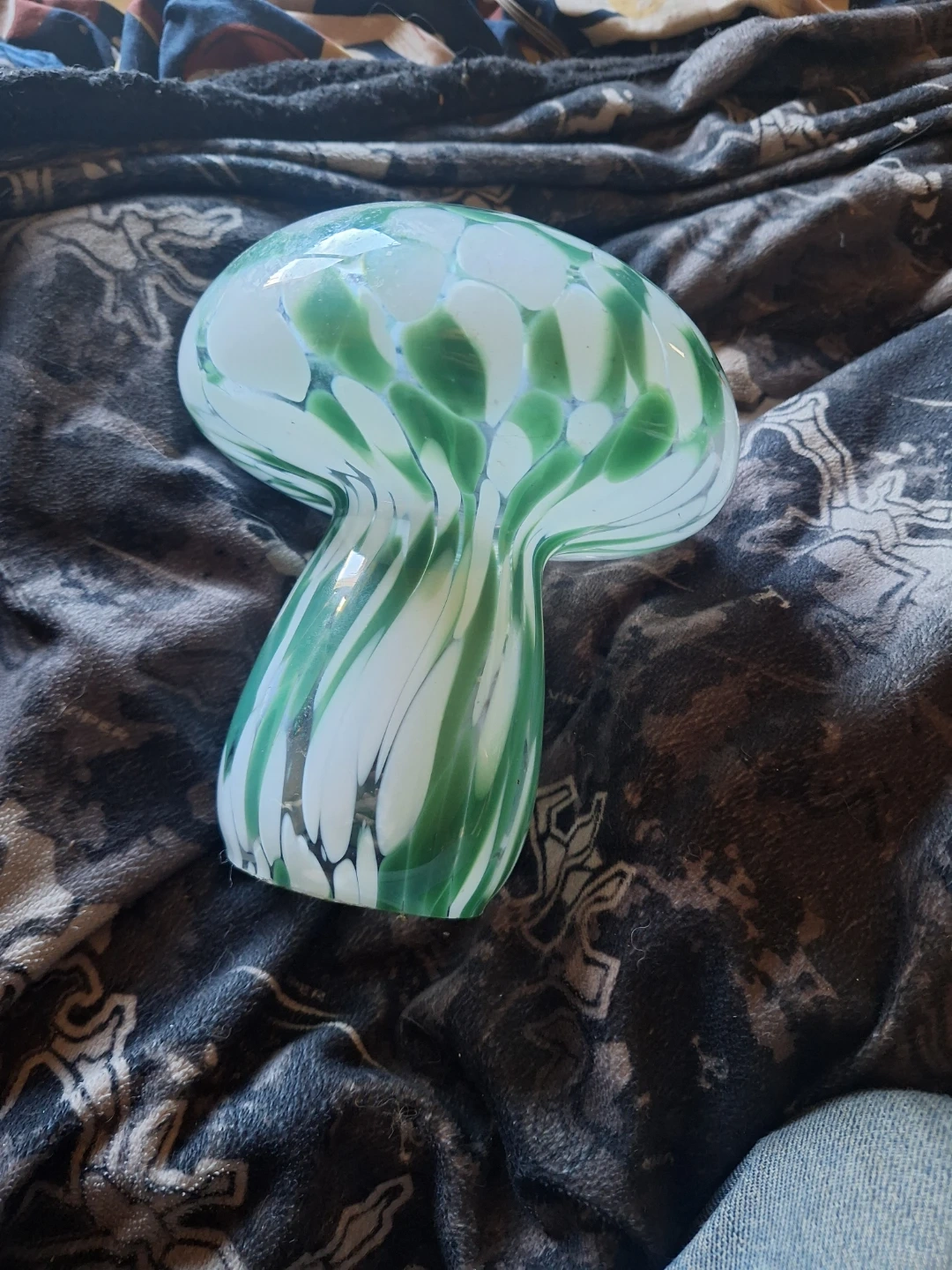 This decorative glass mushroom has a swirled green and white pattern. It's made of blown glass and would look neat on a shelf. It's a fun piece for your home decor!