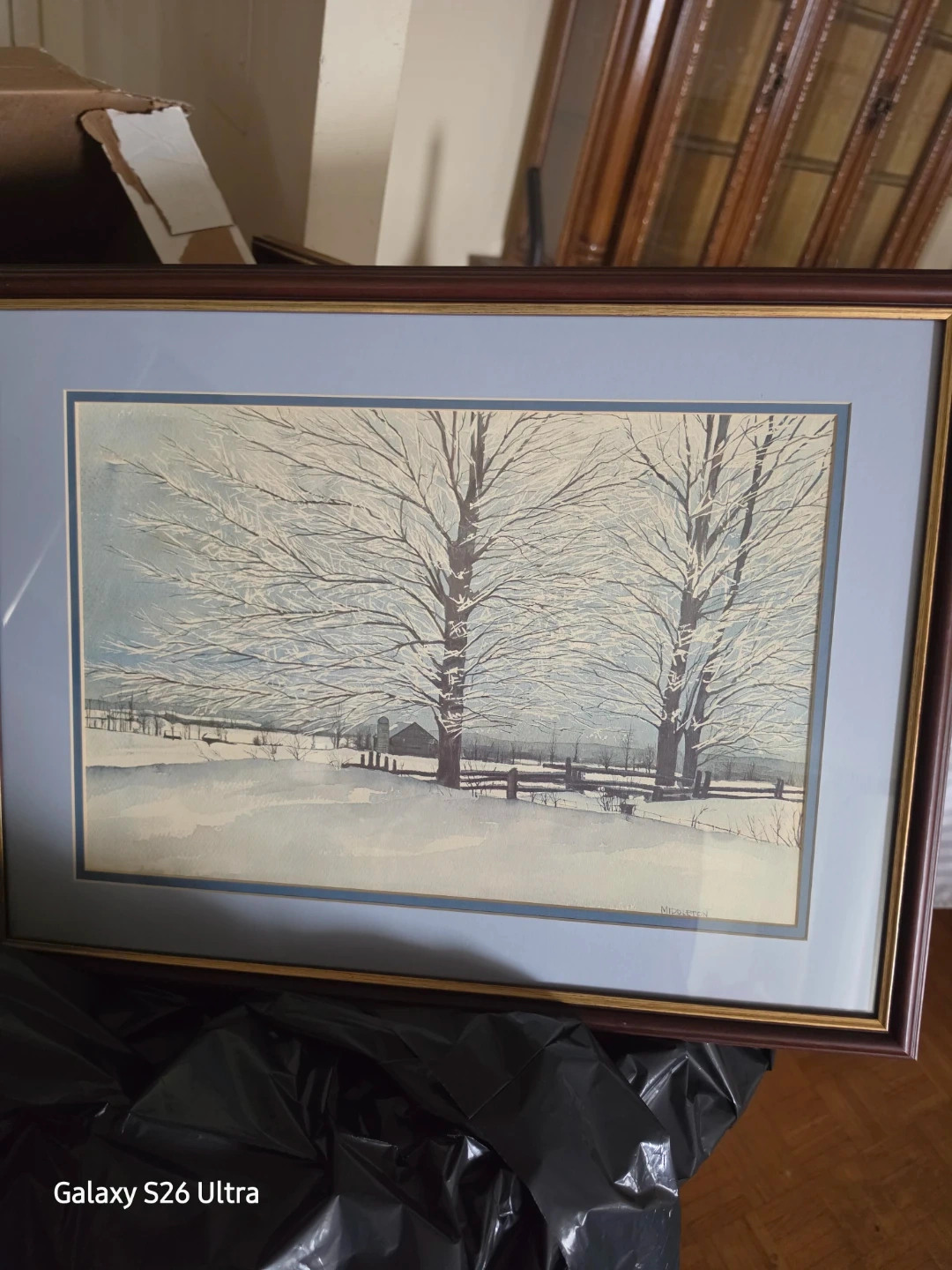 Framed watercolor painting depicting a serene winter landscape with snow-covered trees and a barn. The artwork is signed 'Middleton' and is beautifully matted. It's a lovely piece for adding a touch of rustic charm to any room.